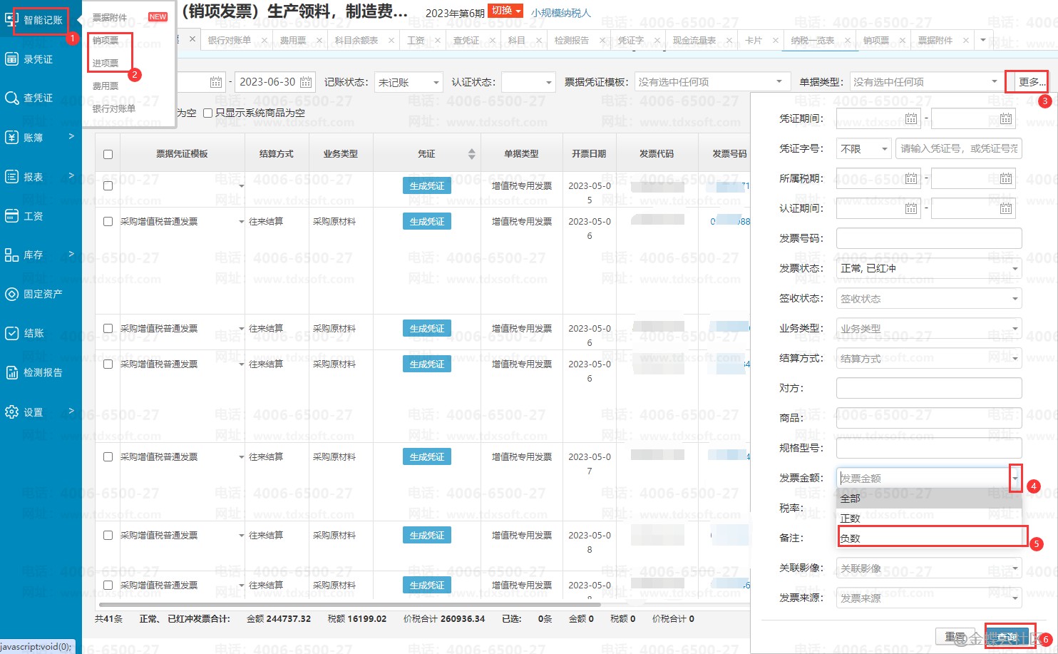 金蝶账无忧V6.0如何一键筛选出发票金额为负数的发票