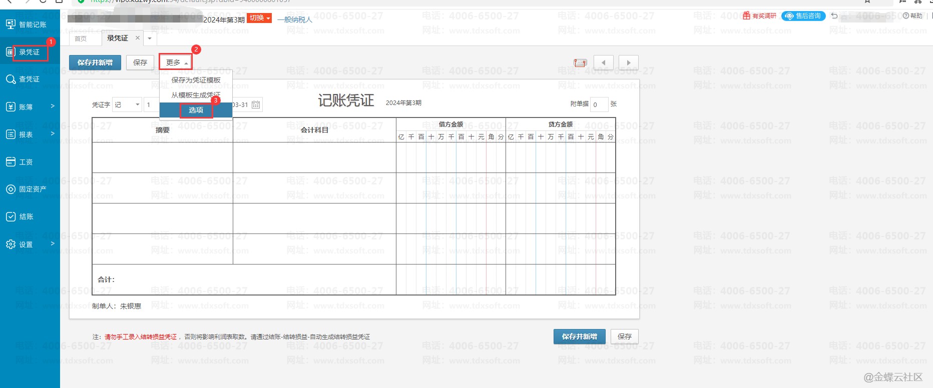 系统默认进入录凭证界面是先录入摘要,如果需要从凭证字开始录入,可以点击【录凭证】→【更多】→【选项】,勾选“录凭证从头开始”即可。设置完成后刷新页面后生效。
