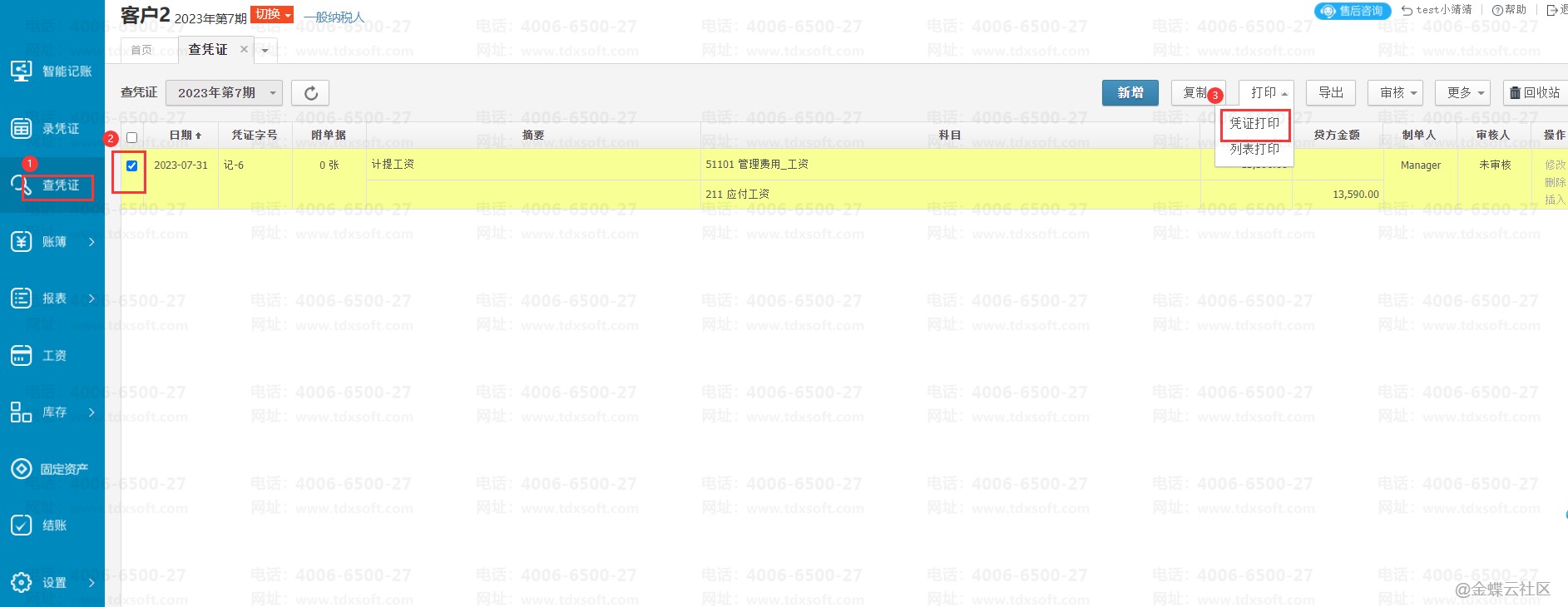 1、首先选择高级打印的方式进行打印:【查凭证】→勾选凭证→【凭证打印】→选择【高级打印】→点击【打印】按钮