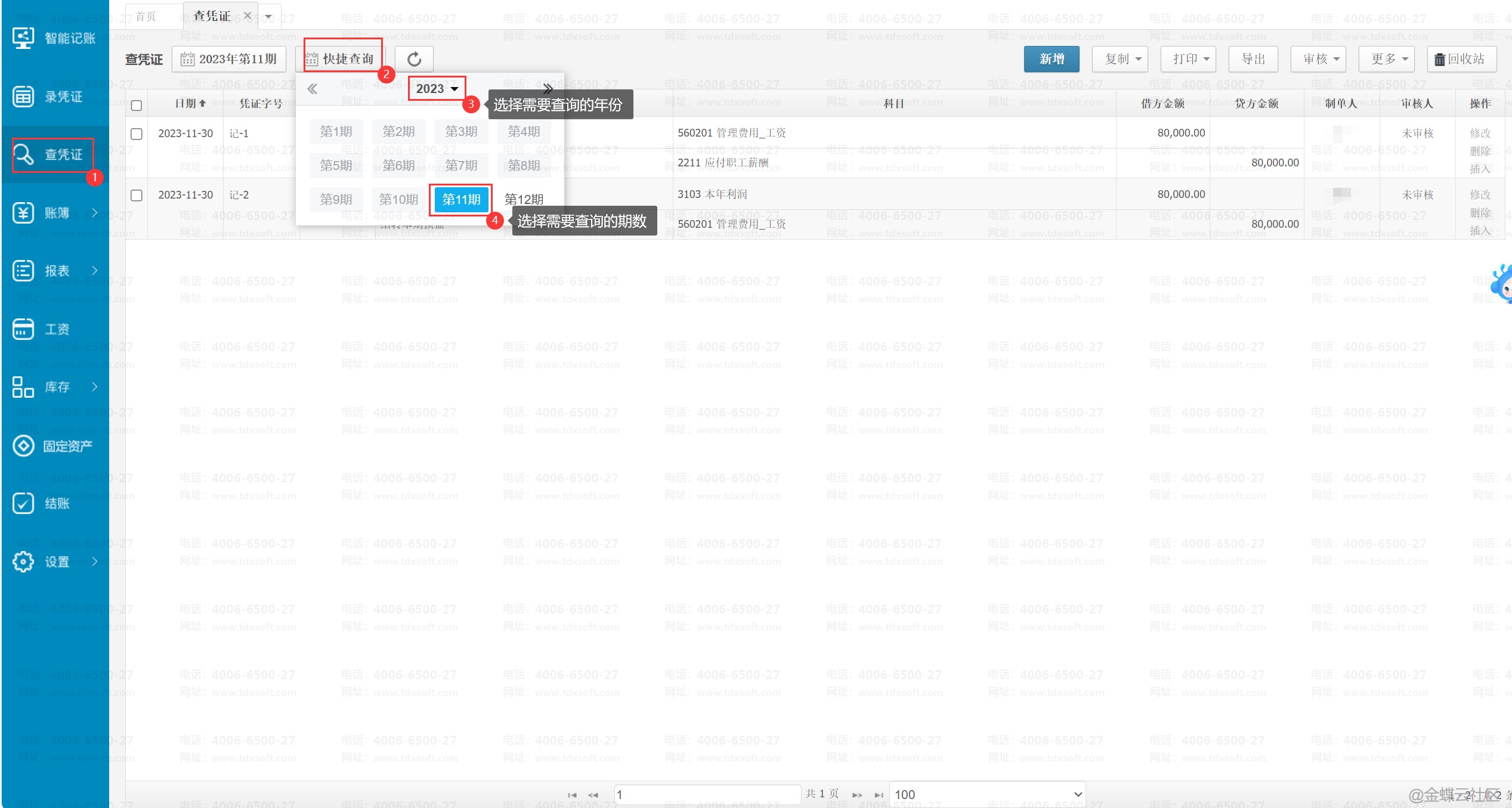 点击【查凭证】后,鼠标放到快捷查询按钮,点击选择需要查询的年份和期数即可查询凭证