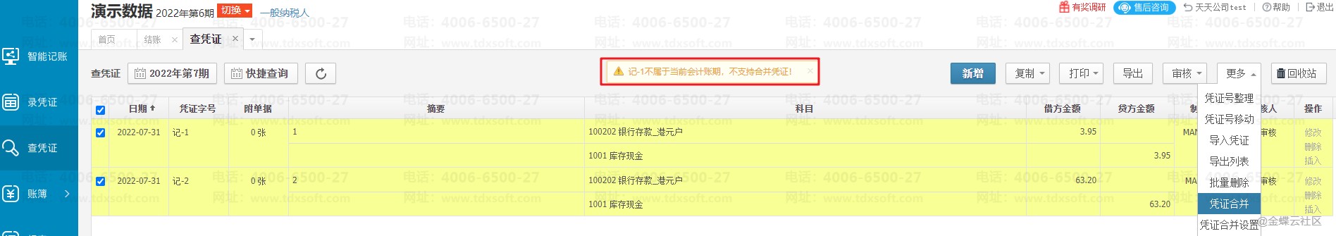 按问题场景描述的图片所示举例,账套的当前账期为2022年6月,操作凭证合并的凭证是2022年7月的凭证,所以无法操作合并凭证。需要将账套结账到2022年7月后,才可以将2022年7月的凭证操作合并。