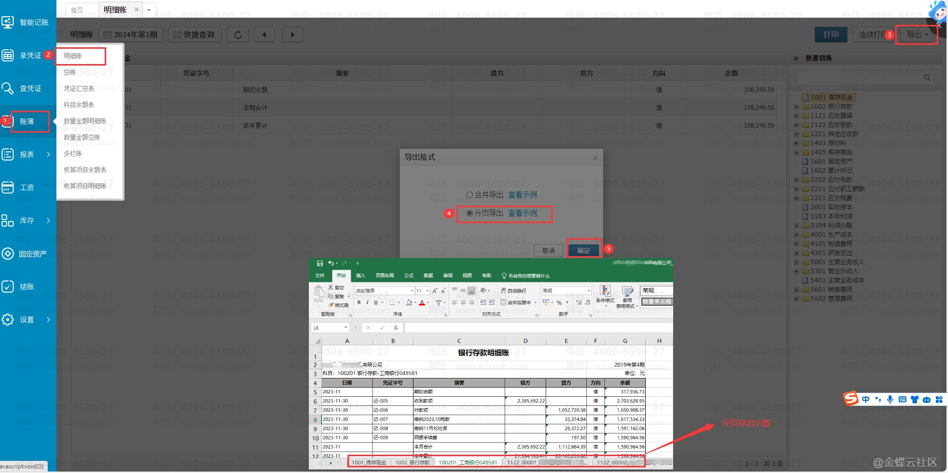 【账簿】→【明细账】→【导出】→选择【导出当前科目】或者【导出全部科目】→点击【分页导出】→【确认】即可。