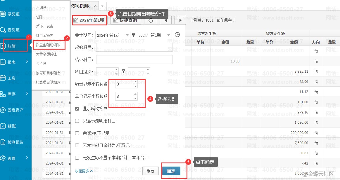 点击【账簿】→【数量金额明细账】,点击日期打开筛选条件,把数量显示小数位和单价显示小数位调成最大的位数(8位),点击【确定】;然后再去计算看数量乘以单价是否四舍五入是否等于金额(金额取两位小数)