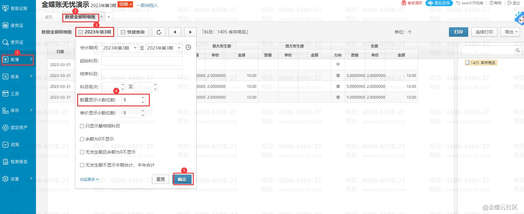 数量金额明细账界面的单价显示系统默认取两位小数,如果单价是0.0049,没法显示出来,可以通过修改筛选条件显示;【账簿】→【数量金额明细账】→点击倒三角→选择单价显示小数位数(最大可调到8)→【确定】即可