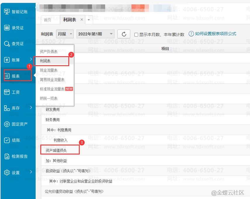 不同的会计制度,利润表的项目不同,新会计准则(2006年颁)的利润表中才有【资产减值损失】项目,如果利润表中没有这个项目说明会计制度不是使用的这个会计准则,可参考下面操作步骤切换会计准则。