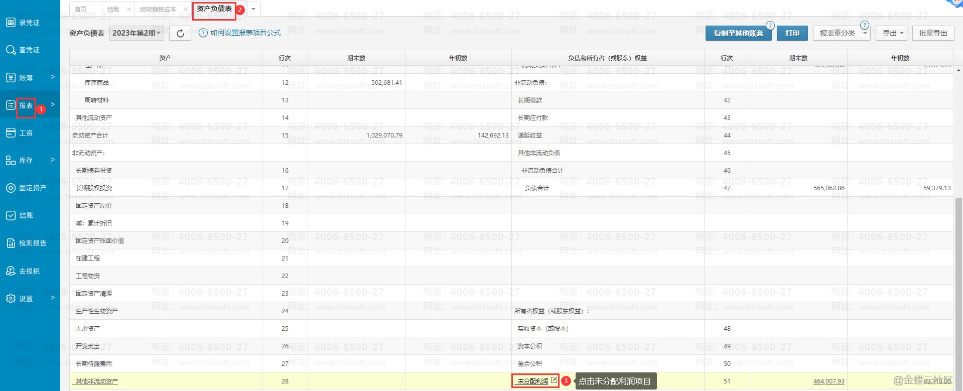 金蝶账无忧本年利润添加到资产负债表哪个项目进行取数