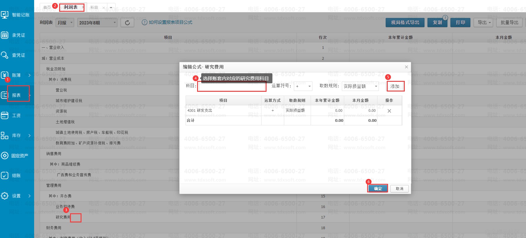 进入账簿→【报表】→【利润表】,鼠标放到项目后点击编辑笔进入编辑公式界面,选择账套内对应的研究费用科目,点击【添加】→再点击【确认】按钮即可。