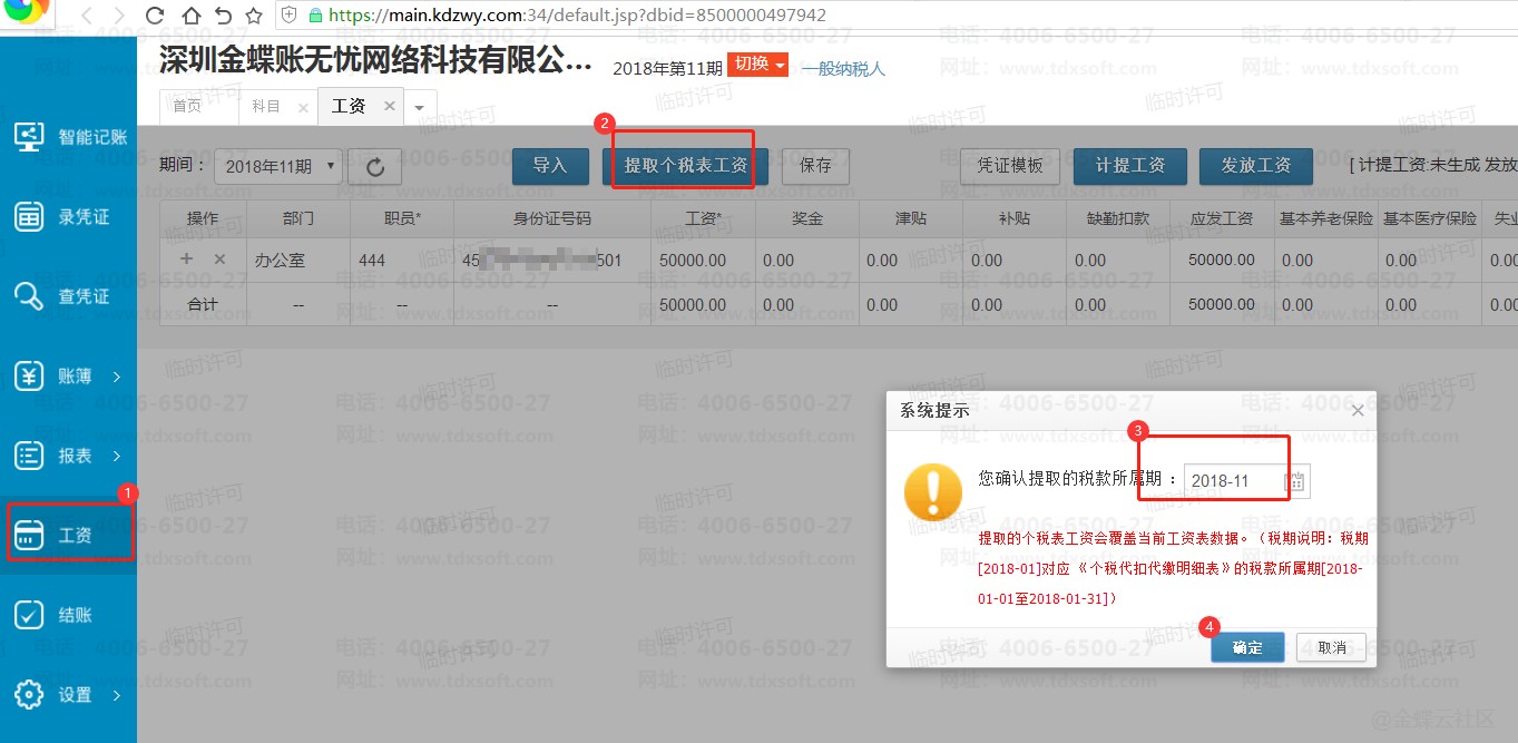 进入账簿后,点击【工资】菜单,进入工资模块点击【提取个税表工资】,选择税款所属期间,最后点击【确定】按钮,提示“提取成功,提取税期XXXX-XX期工资表至会计期间XXXX-XX期成功”即可。