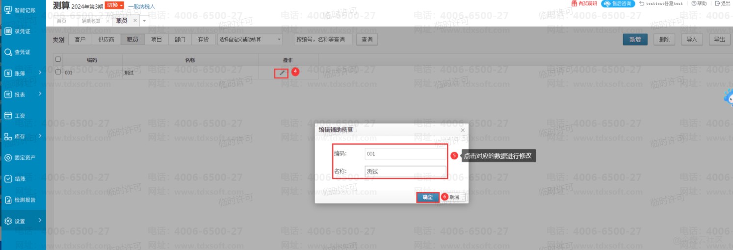 打开【设置】→【辅助核算】→【职员】,编辑修改即可。