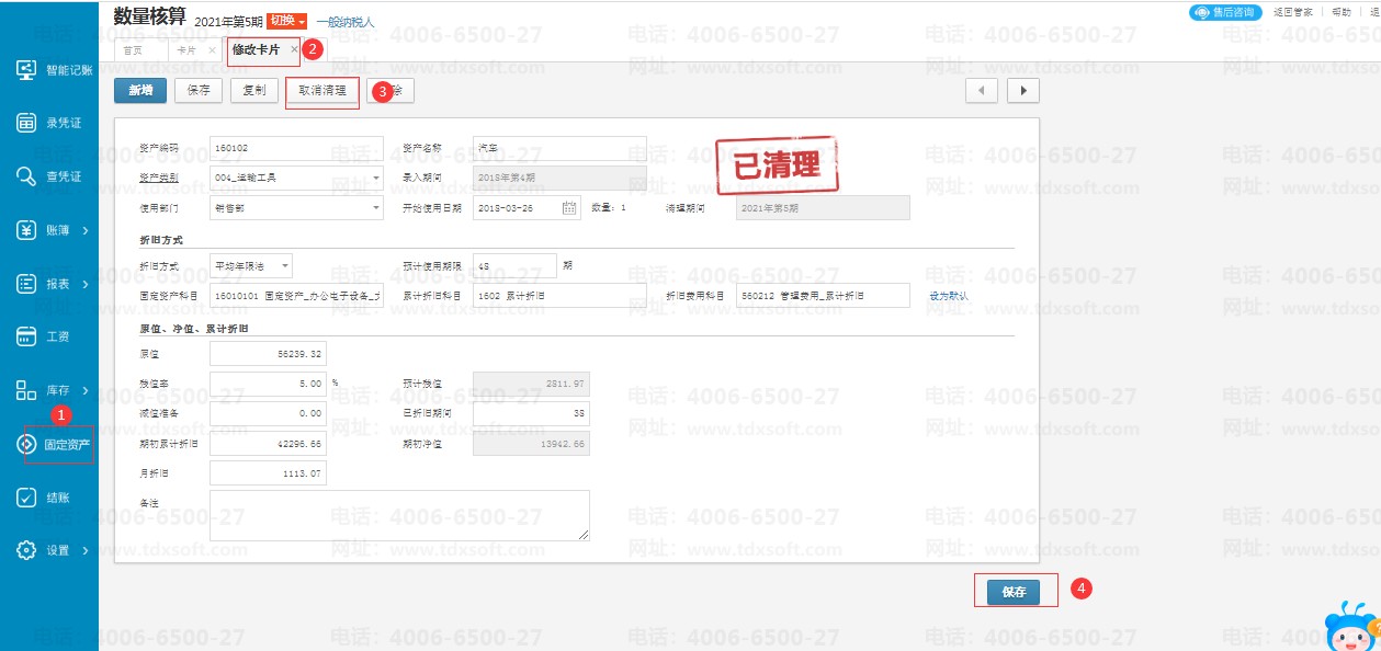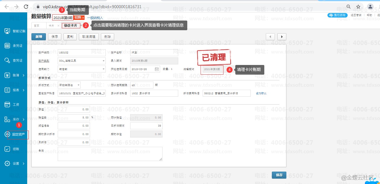 比如以下卡片是在21年5月清理,当期账期是21年6月,需要先反结账到21年5月后再点击【固定资产】点击需要取消清理卡片的编码后进入修改卡片的界面,点击【取消清理】点击【保存】即可