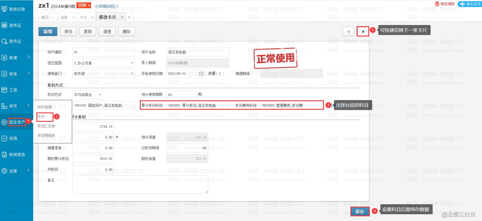 可以点击【固定资产】→【卡片编码】,选择对应的“累计折旧科目”和"折旧费用科目”设置好后点击【保存】,可以点击卡片右上角的“三角符号”切换到下一张卡片。
