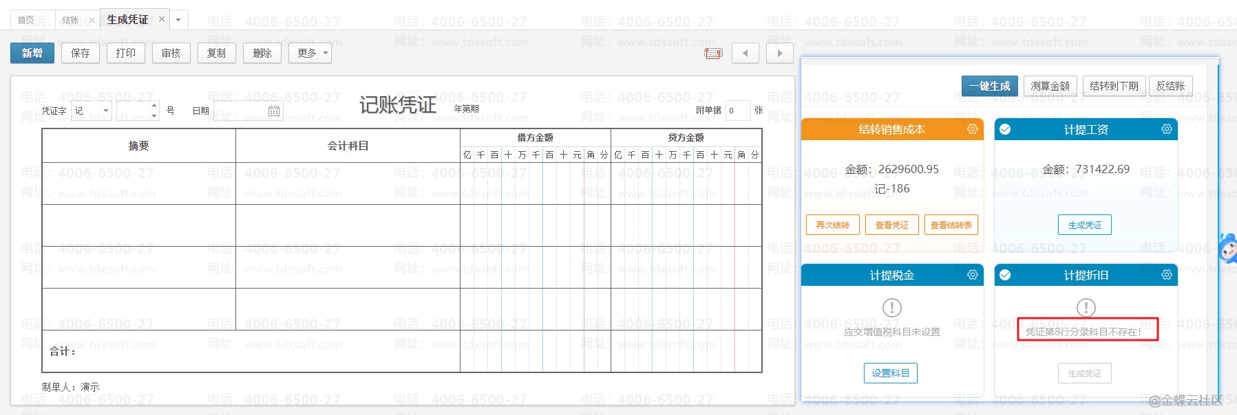 金蝶账无忧计提折旧生成凭证是空白结账界面提示:凭证分录为空如何处理