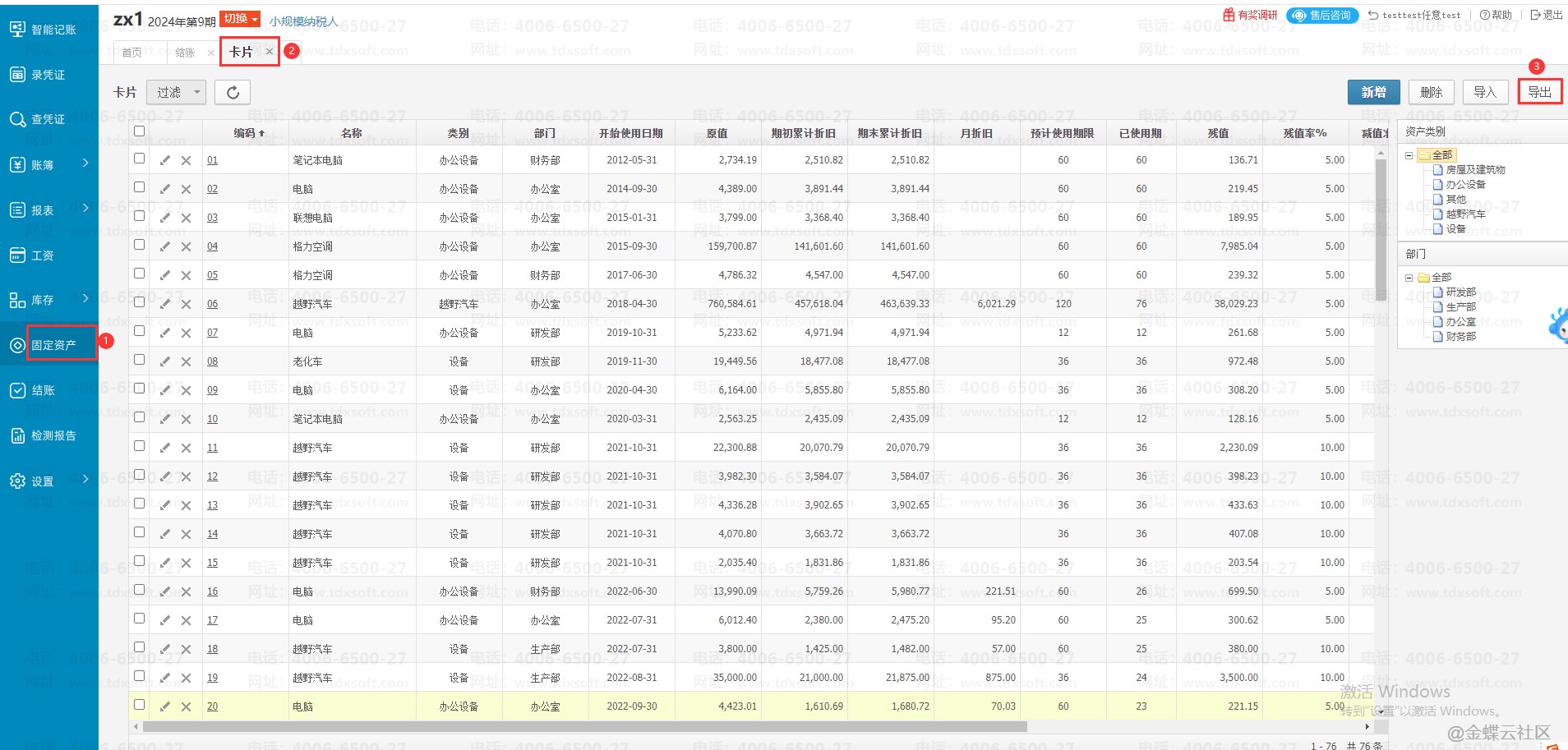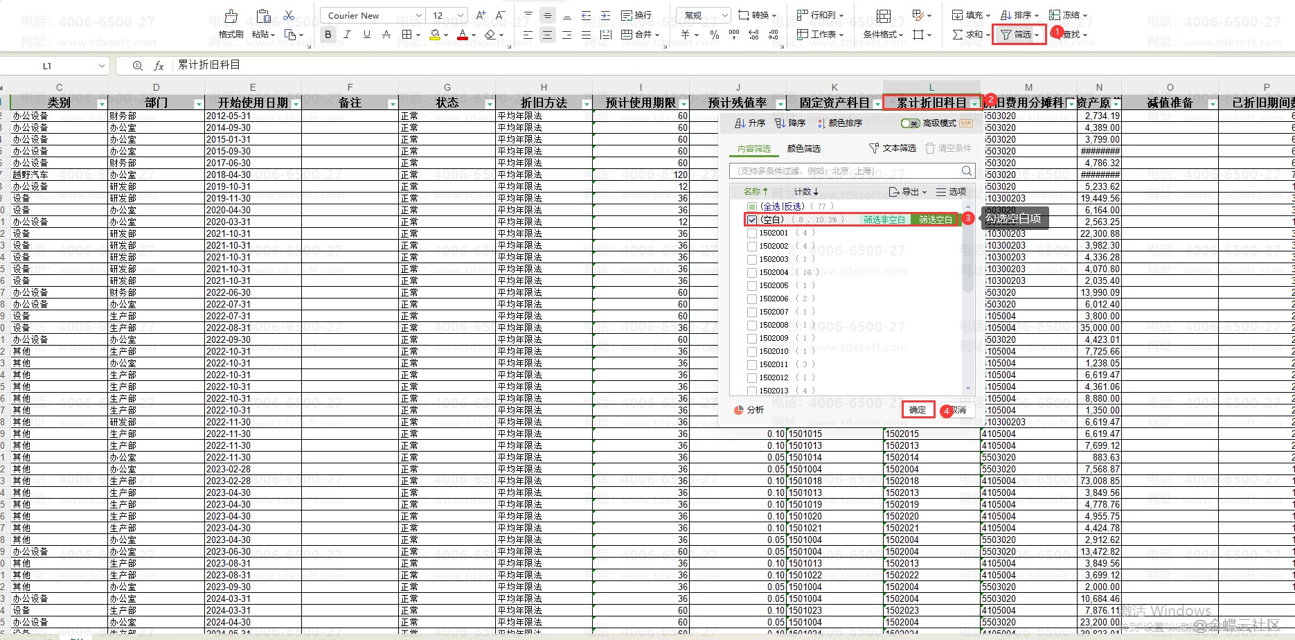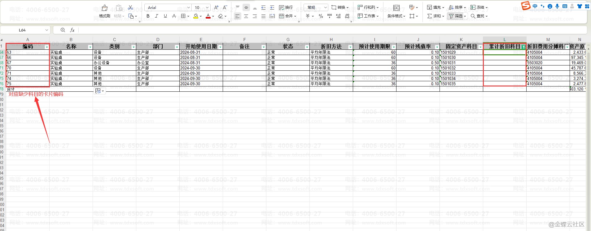 情况二:当卡片数量比较多,单个筛查比较困难时,可以导出卡片列表,在excel文档里面筛选”累计折旧科目”和"折旧费用科目”为空白的卡片,然后回到账套选择对应的卡片补录科目即可。