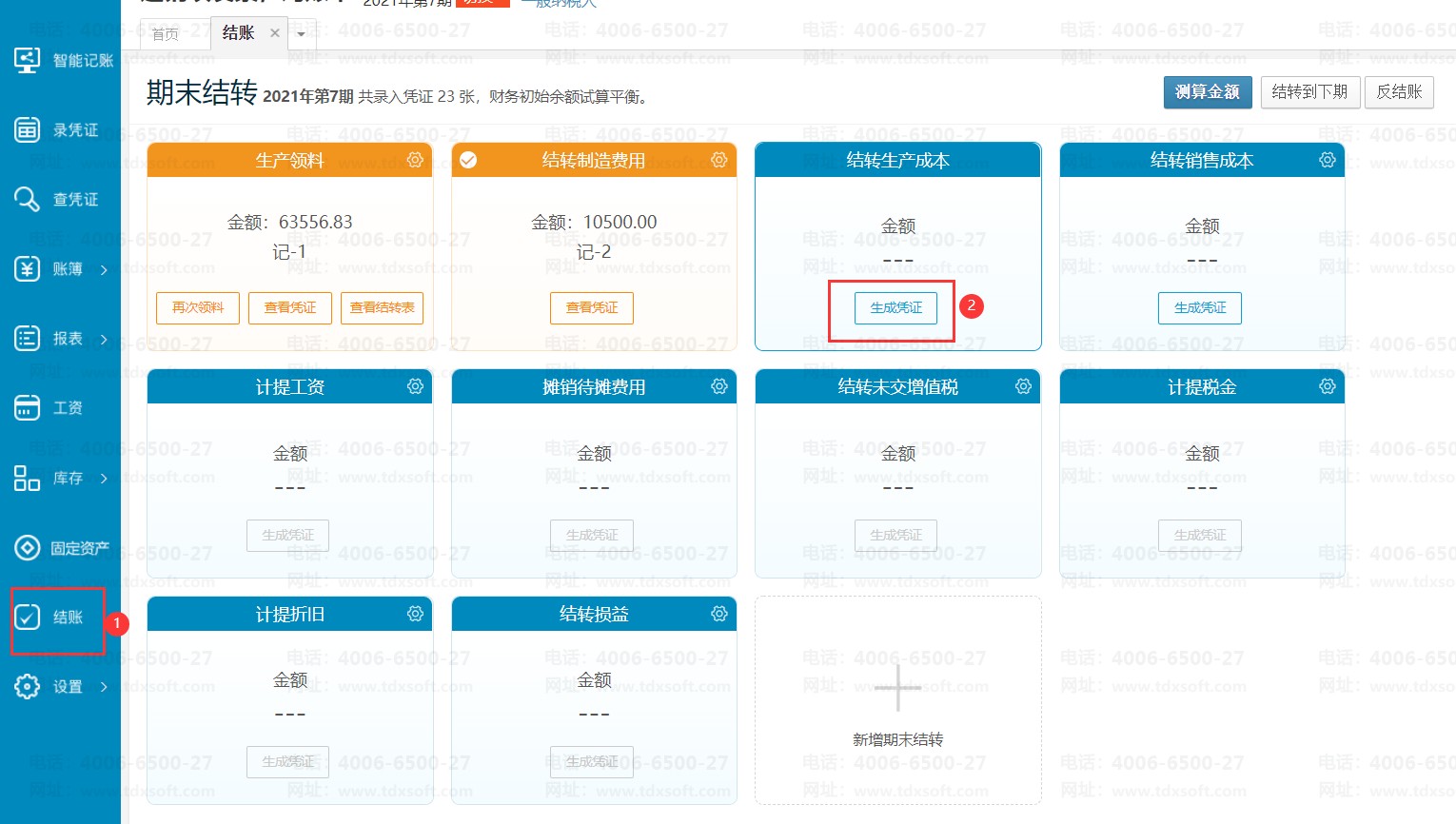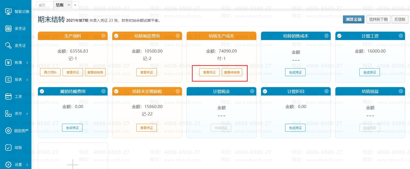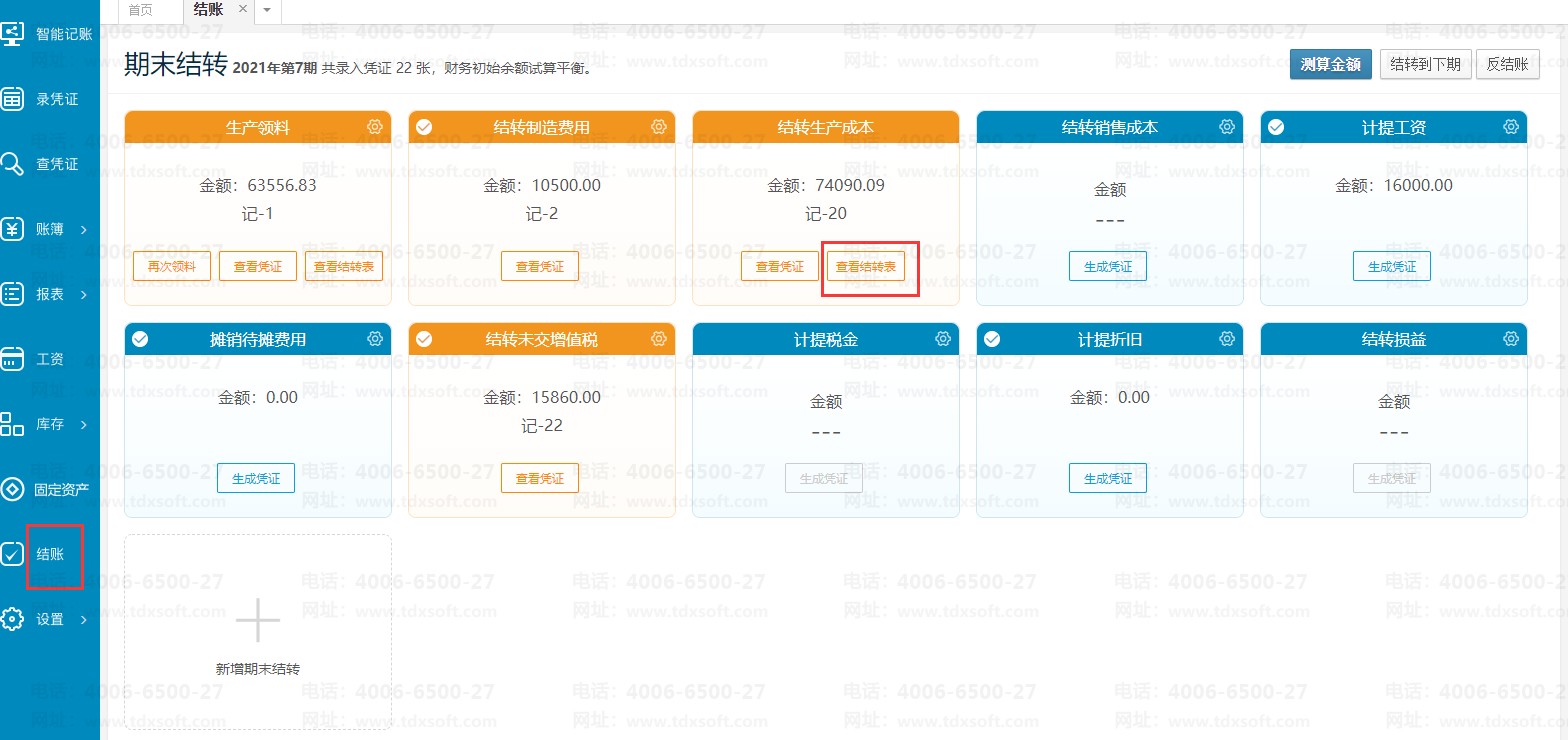 操作完成后可以在结账界面查看凭证数据和结转表数据,点击【查看凭证】按钮即可查看凭证,点击【查看结转表】按钮即可查看具体的结转数据。