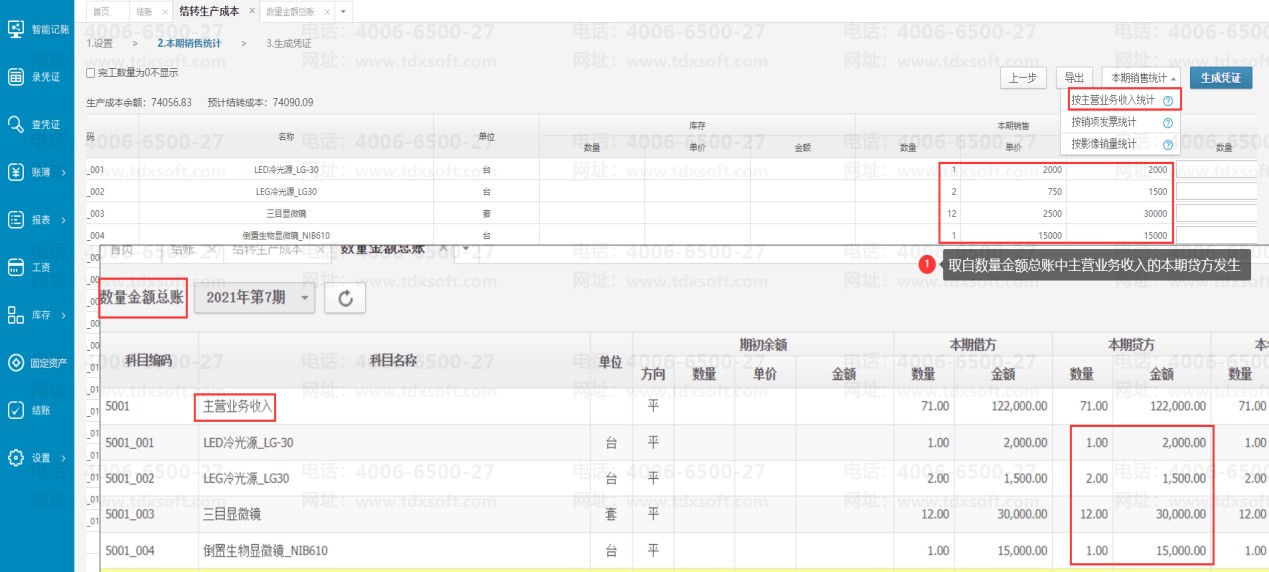 注意:选择按主营业务收入统计后,界面上显示的本期销售数据来源于数量金额总账中主营业务收入的本期贷方发生额。