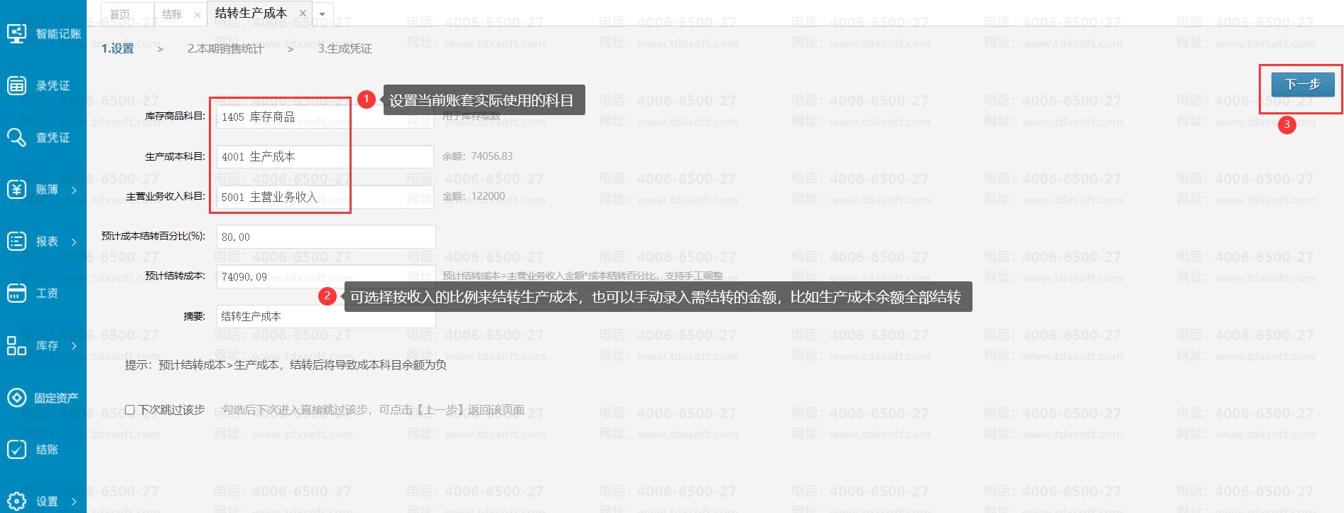 进账簿后点击【结账】菜单,进入结账界面后,点击【结转生产成本】模块的【生成凭证】按钮,进入结转生产成本的设置界面,需设置账套中使用的库存商品科目、生产成本科目、主营业务收入科目,系统会自动根据主营业务收入科目本期贷方发生额乘以“预计成本结转百分比”算出“预计结转成本”的金额。因为系统并没有完整的生产数据,企业一般会根据以往的经验,按照主营业务收入的一定比例结转生产成本。目前系统默认主营业务收入的80%来算出预计结转成本金额,也可根据企业实际情况修改结转比例或直接手动录入预计结转成本的金额,然后点击【下一步】。