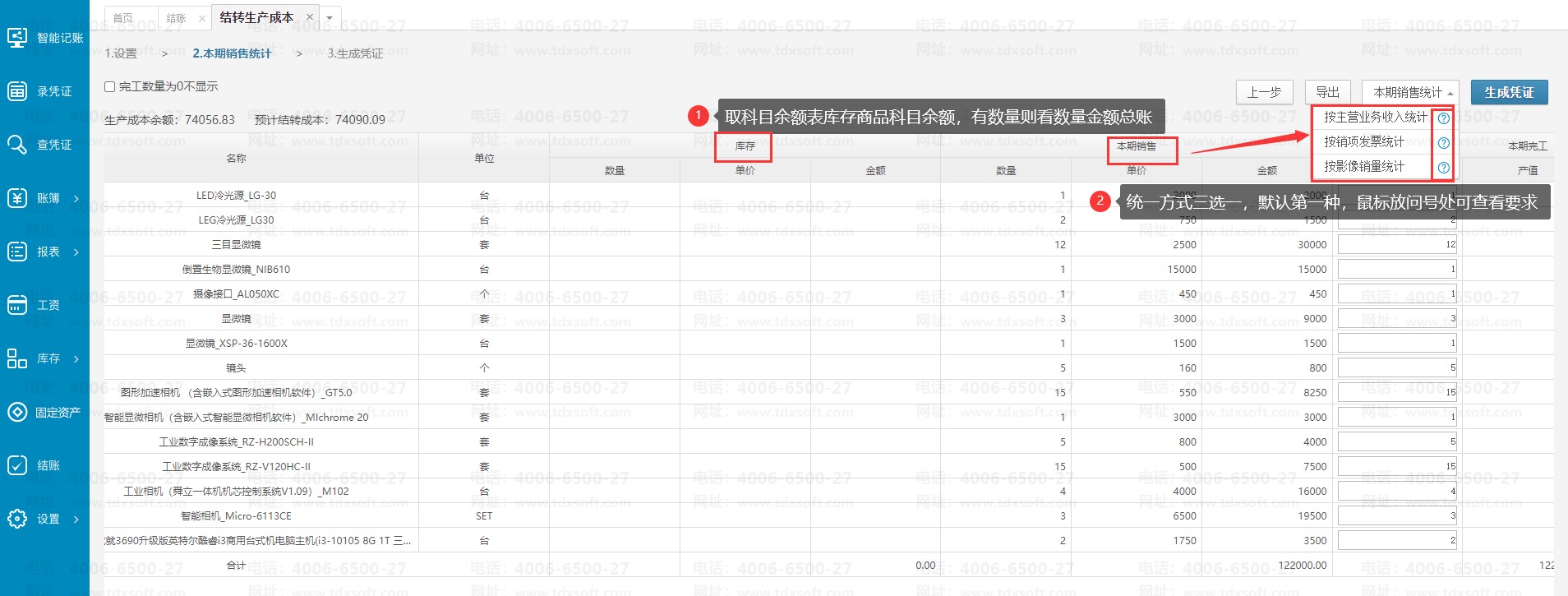 设置完成后,进入本期销售统计界面。因为系统没有完整的生产数据,所以只能按销售的商品数据来倒算本期需完工的库存商品数量,本月完工产品数量 = 本月销售数量 - 期初库存数量,本期完工产品数量也可以手工录入。其中期初库存数据取数于“库存商品”对应科目期末余额,有做数量核算,则取数于数量金额总账的余额。本期销售数据统计现有以下三种统计方式(按主营业务收入统计、按销项发票统计和按影像销量统计),可选择其中一种,或手动录入本期完工成本数量。