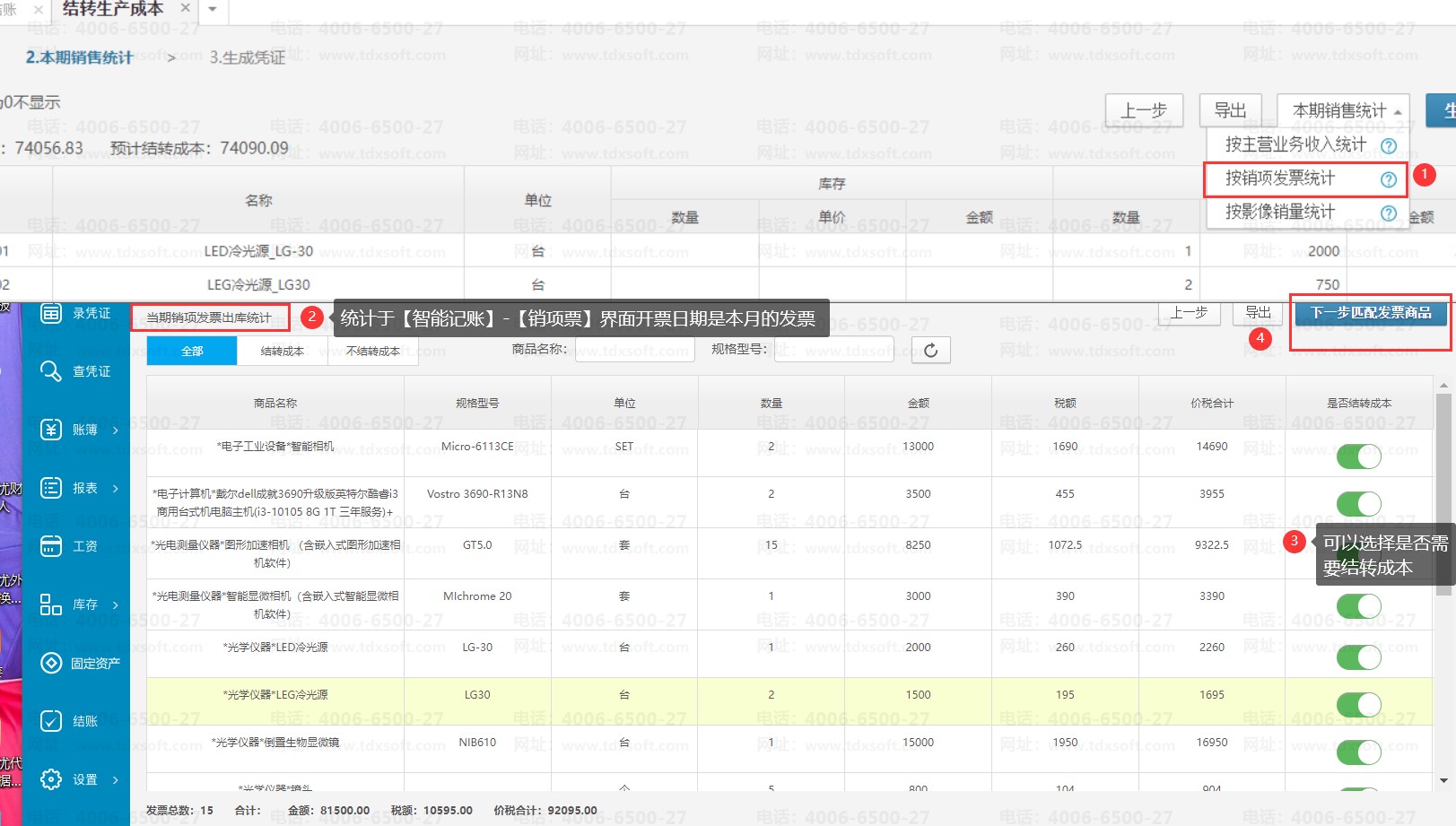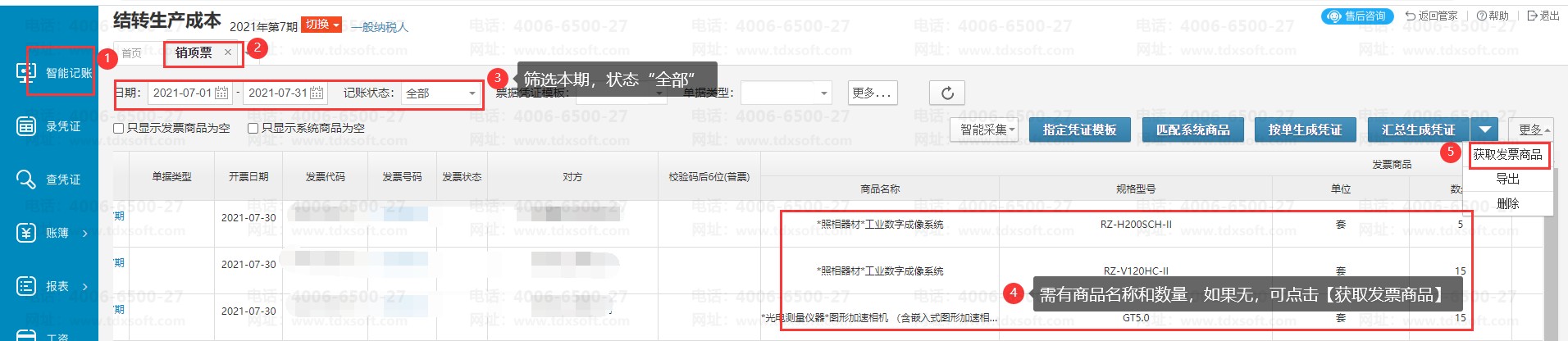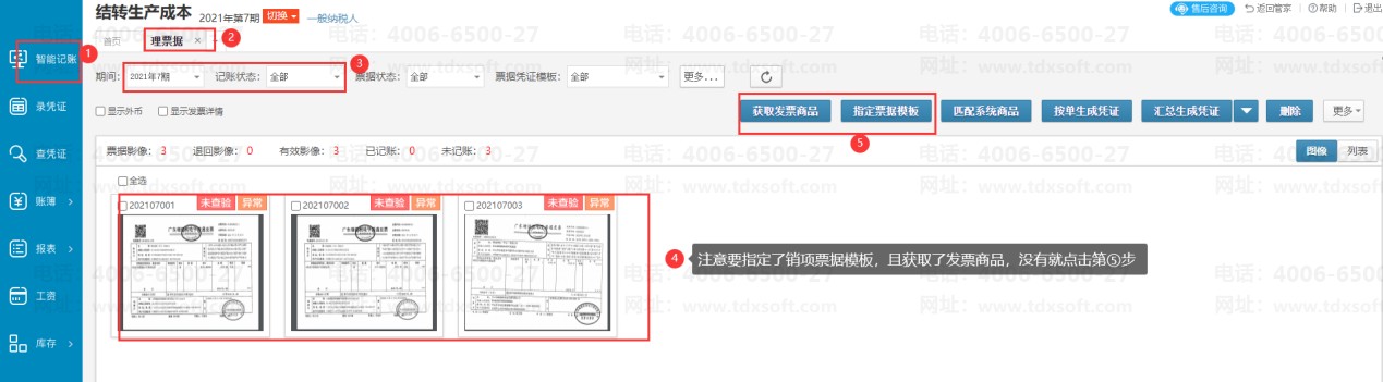 选择按销项发票统计,需要满足以下要求:账套中【智能记账】→【销项票】界面,需要有开票日期是本期的销项发票,并且销项发票界面上显示有发票商品明细和数量。