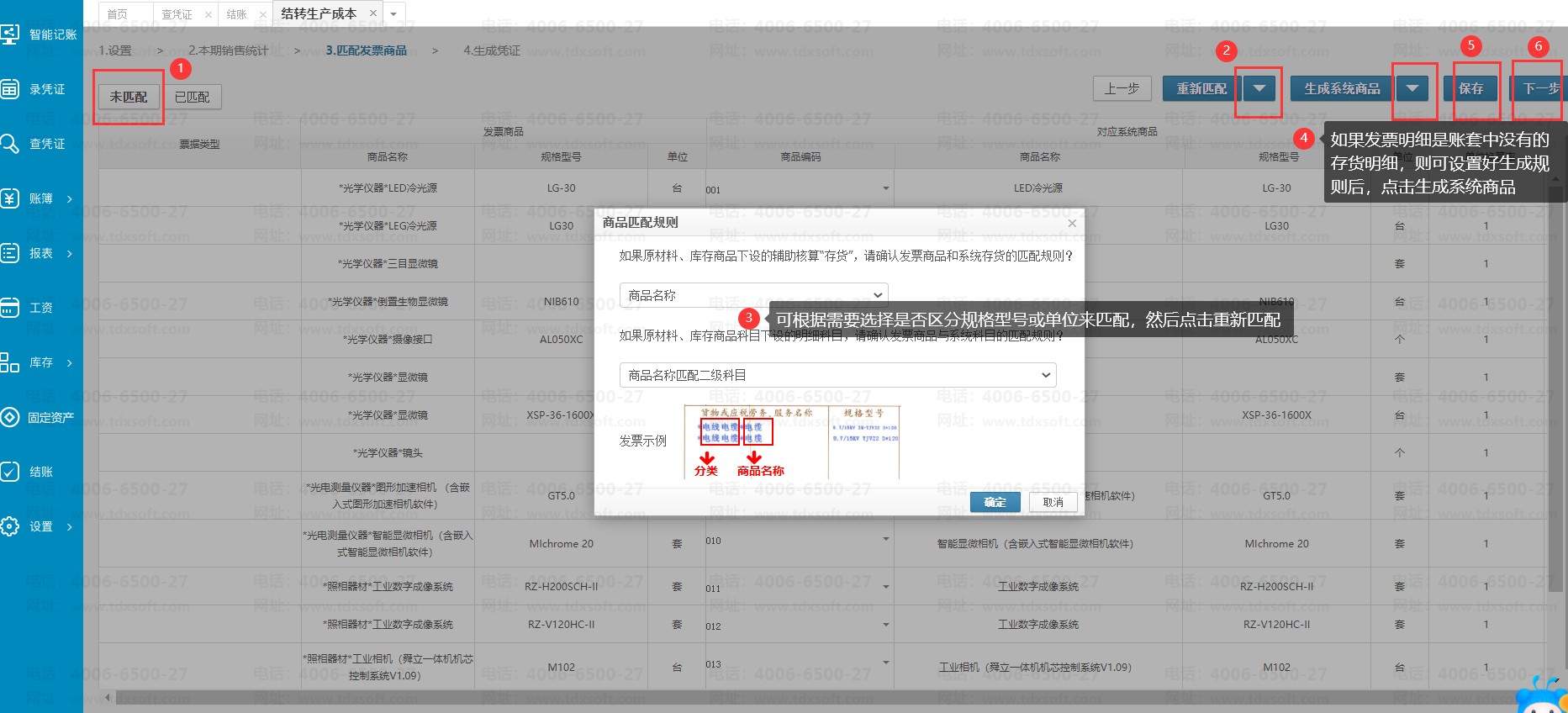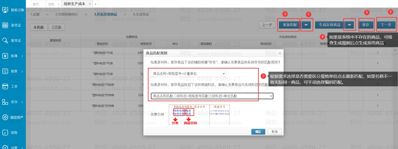 点击【按影像销量统计】,会带出符合以上要求的影像发票明细,点击【下一步匹配发票商品】,到【未匹配】界面,如果系统已存在对应商品科目,鼠标移动到【重新匹配】按钮右边的倒三角符号点击【匹配规则】按钮,在商品匹配规则弹窗中可选择是否区分规格型号或单位来匹配系统中已有的商品名称,设置完成后点击【确定】按钮,然后点击【重新匹配】(如果是发票明细和系统中的商品名称不一样,但是代表同一个商品时,需手动选择编码匹配),系统则会根据选择的匹配规则来重新将发票商品和做账商品做匹配;如果发票明细是系统中做账暂时还没有新增的商品科目,需要系统自动新增这些科目,同理可先设置好【商品生成规则】后,再点击【生成系统商品】。确认匹配信息无误后点击【保存】按钮,再点击【下一步】,则会回到结转成本界面,将发票的数据带入填写到本期销售数据,算出本期完工数。
