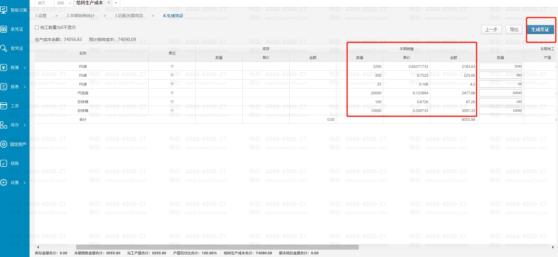 确认本期完工数量无误的情况下点击【生成凭证】按钮即可生成凭证。