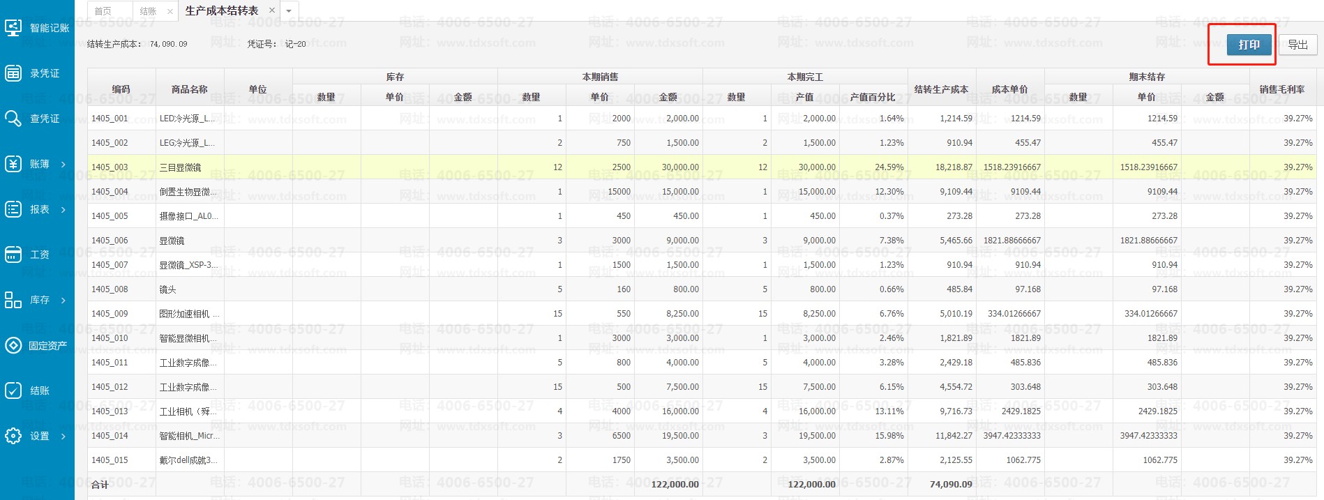 1.打印生产成本结转表