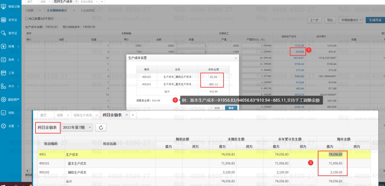 实际业务场景中不同产品的生产成本组成比不完全相同,点击蓝色字体生产成本金额可手工调整。