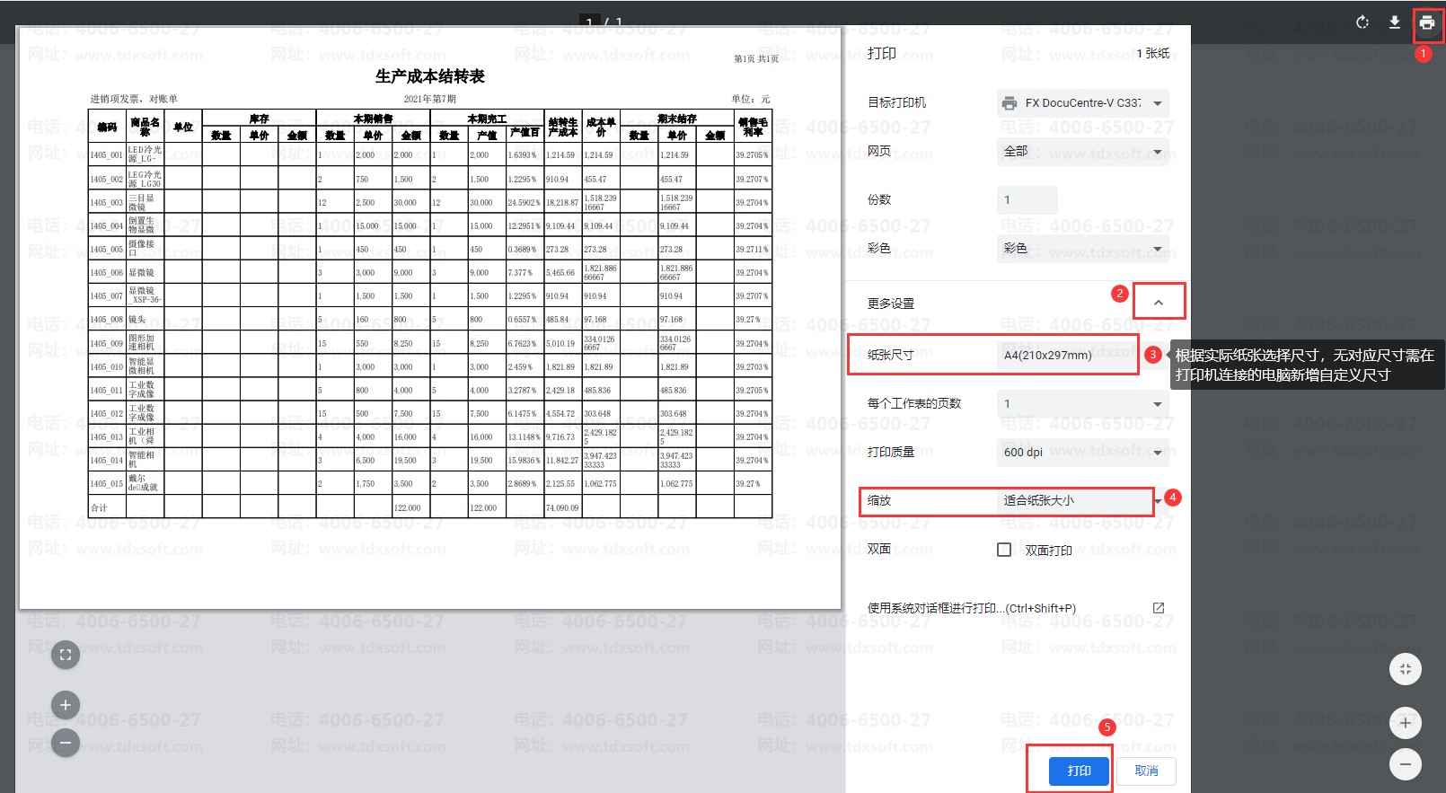生成凭证后,在结转生产成本模块点击【查看结转表】,进入结转表界面,右上角点击【打印】,进入打印预览界面,“纸张尺寸”选择实际使用的纸张大小,“缩放”建议选择“适应纸张大小”,预览效果无误后点击【打印】按钮即可。