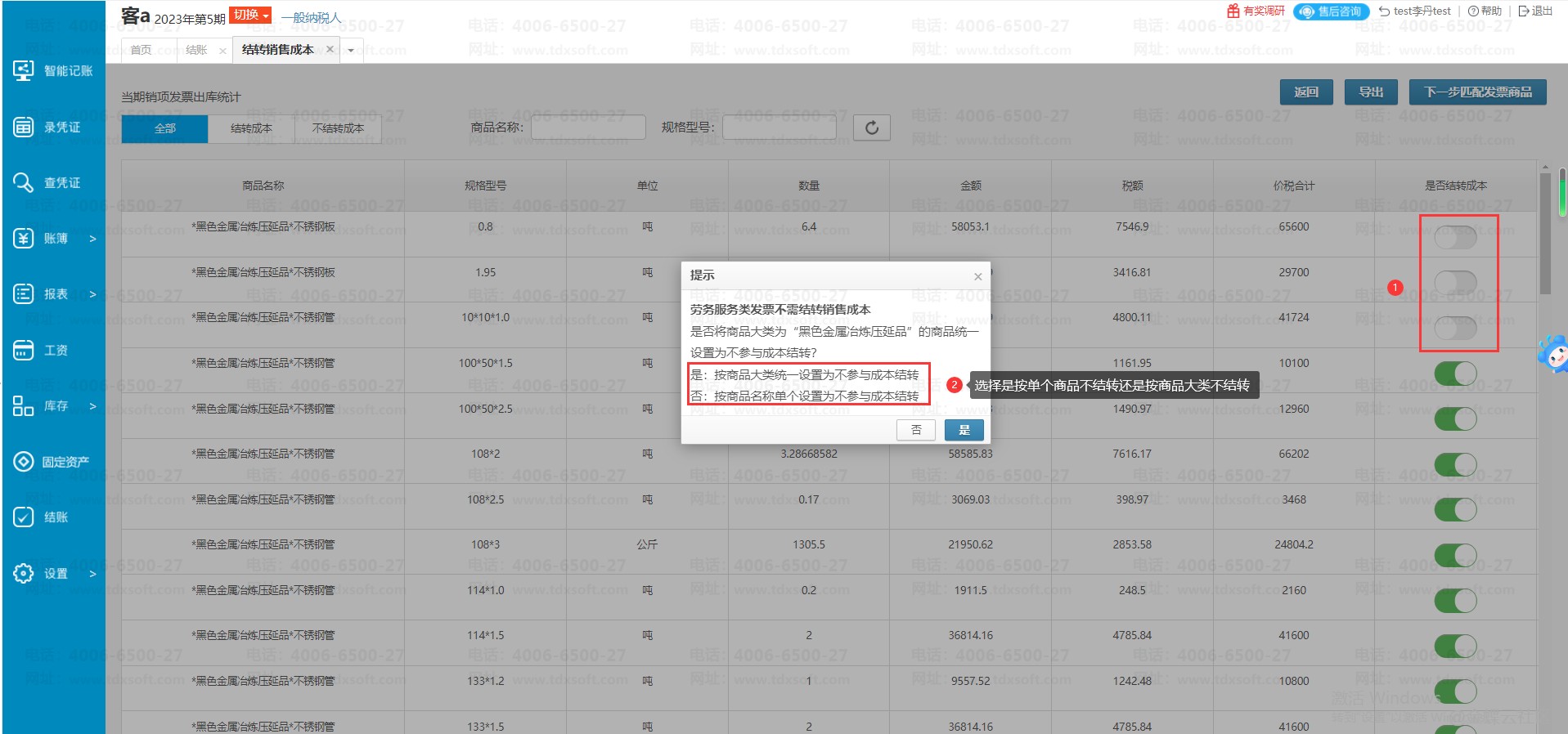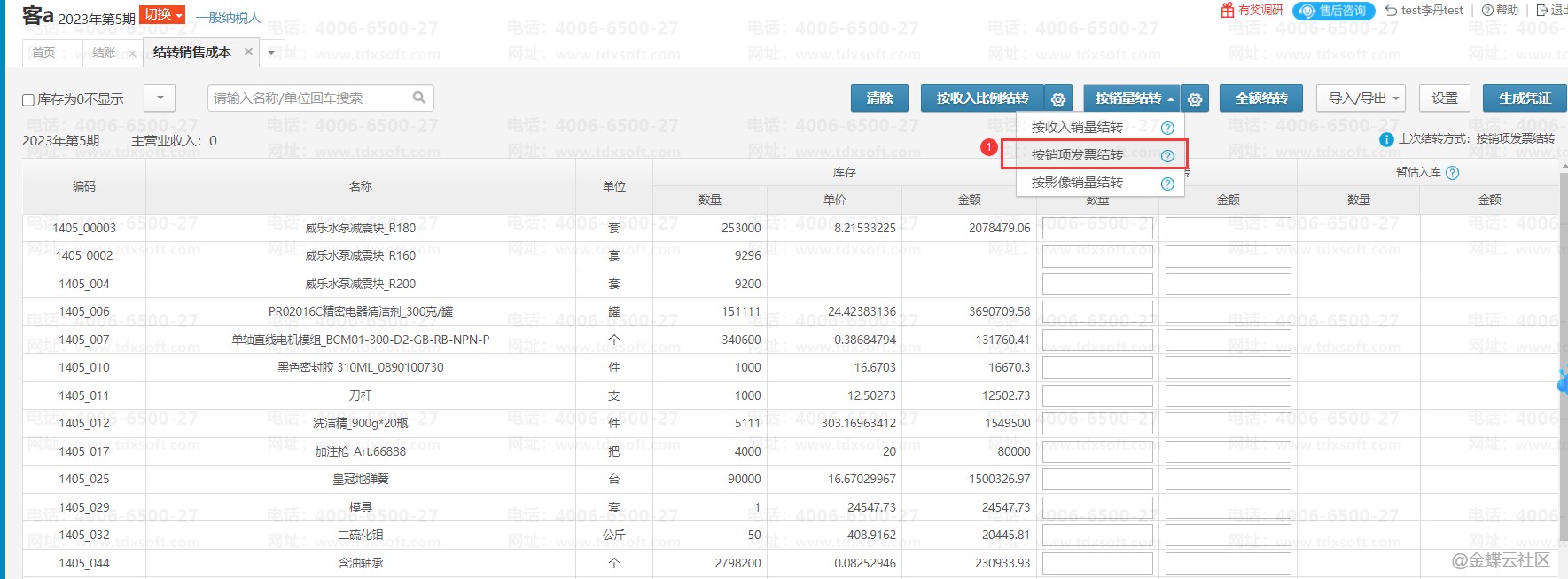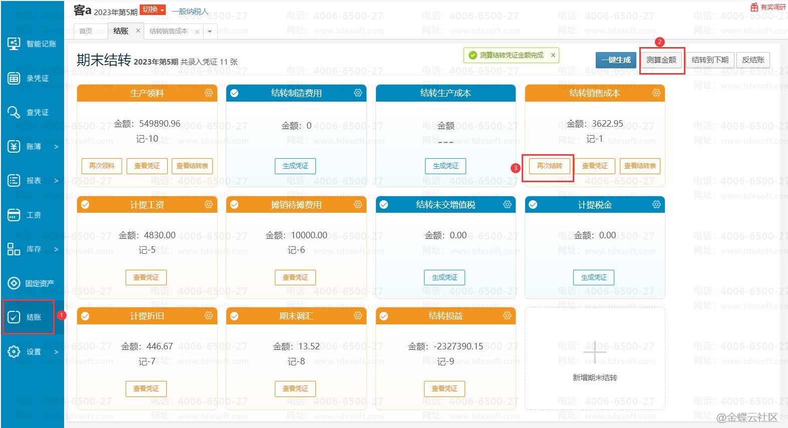 1.进账簿点击【结账】→【测算金额】点击结转销售成本的【再次结转】