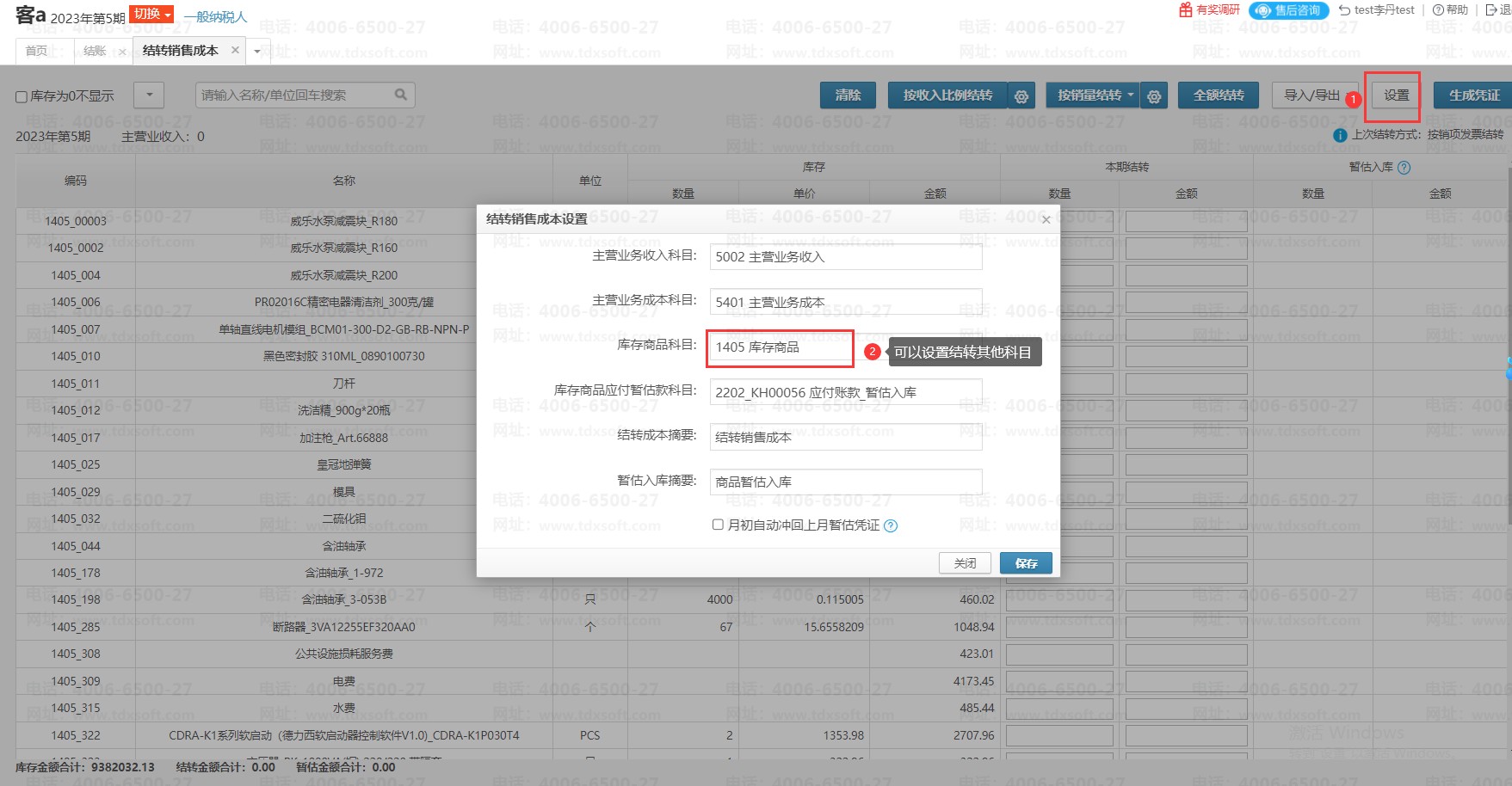 2.进入结转界面之后,可以点击【设置】,设置再次结转的科目,比如之前结转的库存商品科目是140501,可以重新设置为140502来再次结转