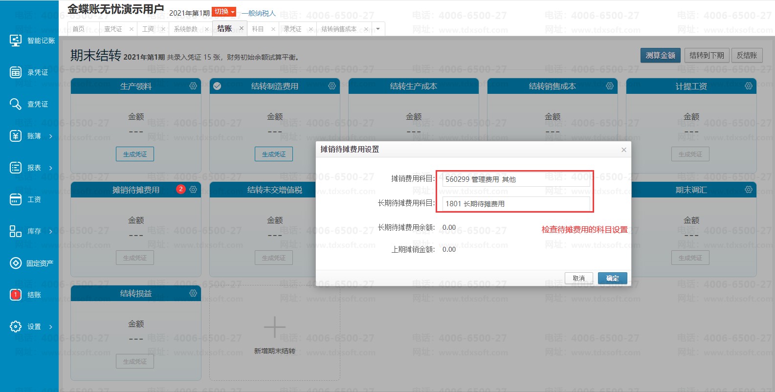 进入账簿后的【结账】 -- 点击摊销待摊费用卡片的右上角齿轮图标 -- 查看【摊销费用科目】和【长期待摊费用科目】设置的两个科目是否填写或者是否填对,填写正确科目后点击【保存】按钮后,点击【测算金额】后【生成凭证】即可