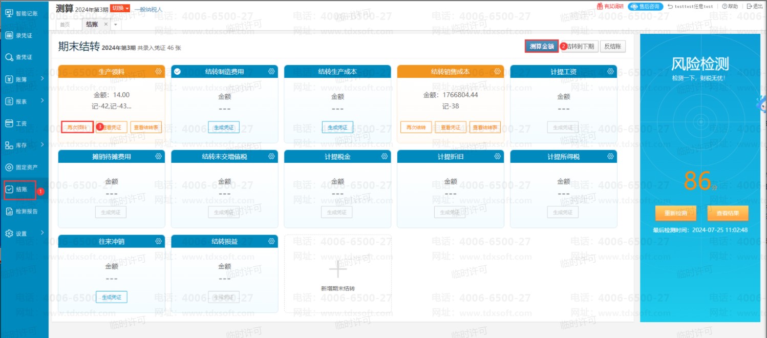 1、点击【结账】,点击【测算金额】,点击【再次领料】