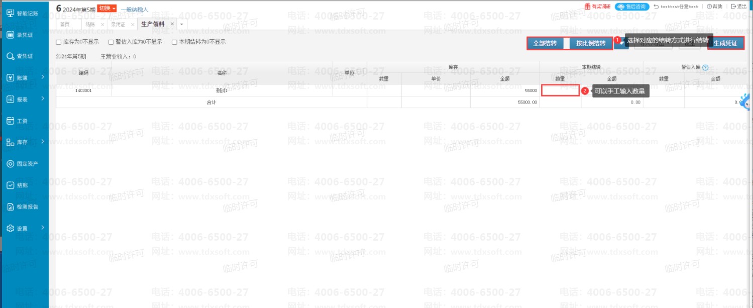 2、进入生产领料界面后选择对应的结转方式或者手工填写数据,填写好数据后点击生成凭证即可。