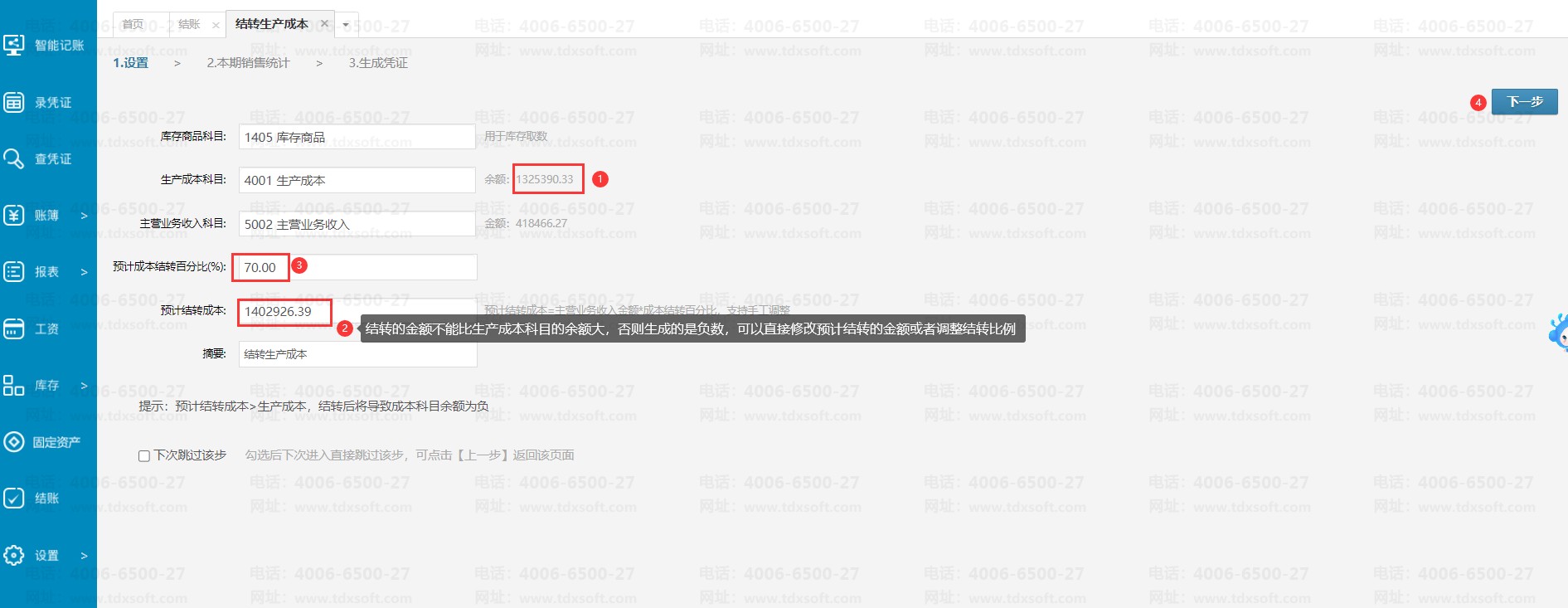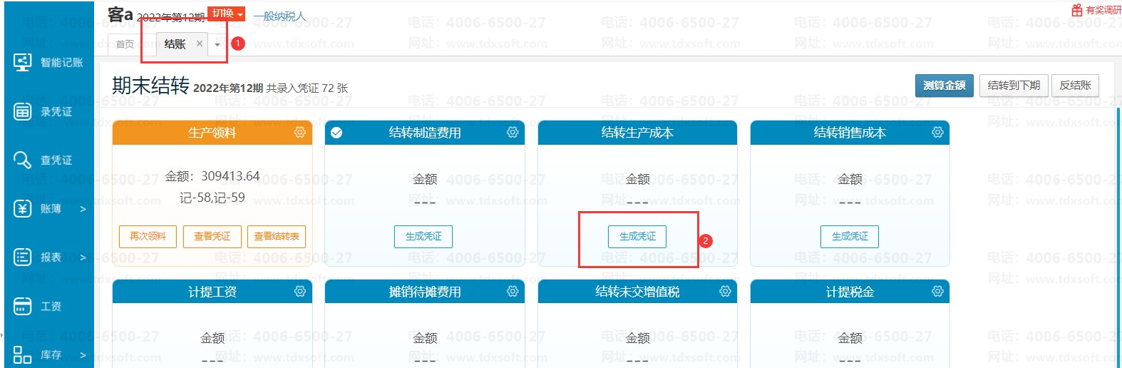 2. 然后在【结账】界面,点击结转生产成本的“生成凭证”按钮,查看预计结转成本的金额是否>生产成本的金额,如果结转金额比生产成本的数据大,需要修改结转比例或直接修改预计结转成本。修改后重新生成结转生产成本凭证即可。