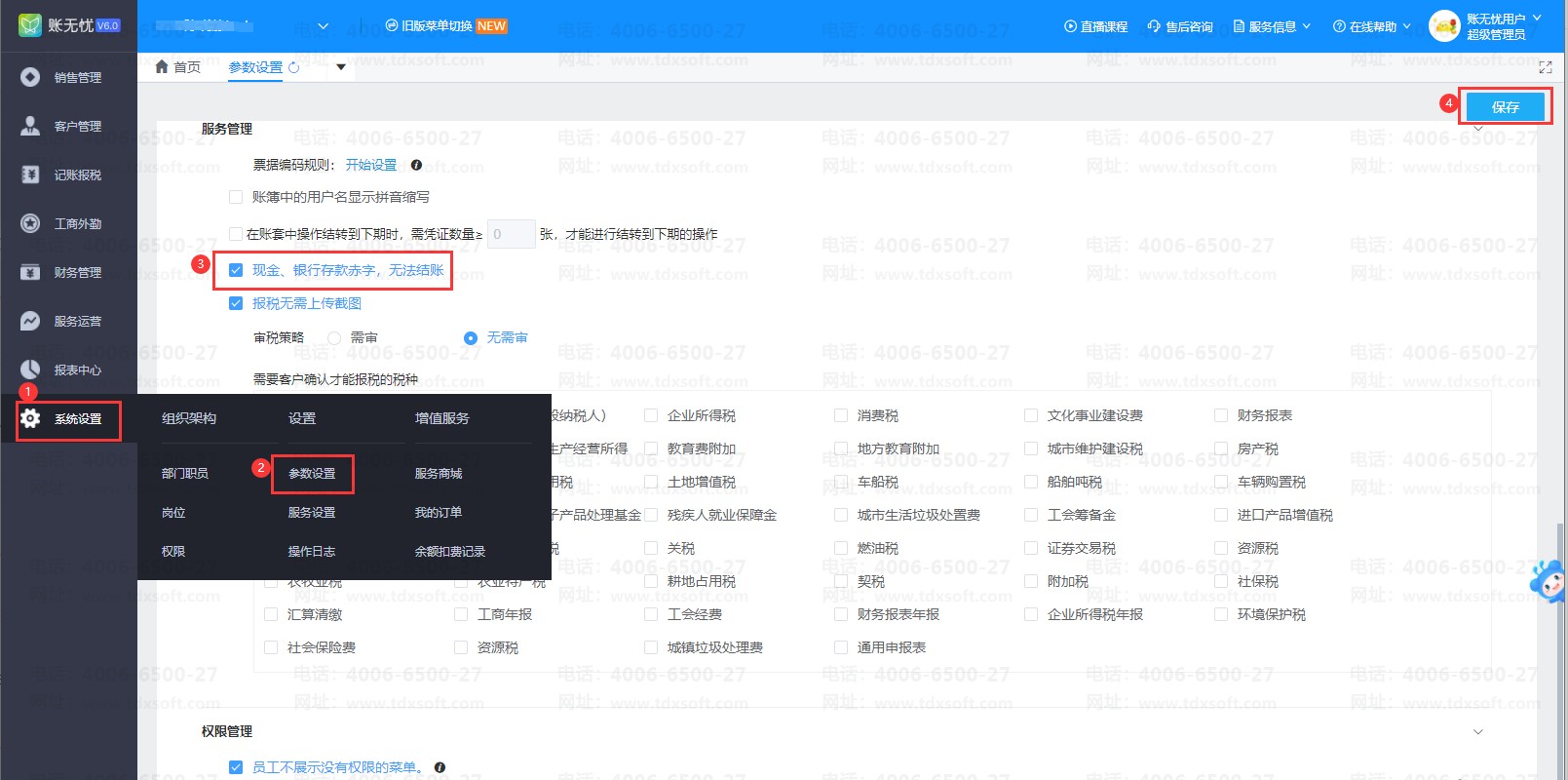 在登录账无忧打开【系统设置】→【参数设置】,在参数设置里找到【现金、银行存款赤字,无法结账】的参数勾选上,然后点击【保存按钮】,再重新刷新账套即可。