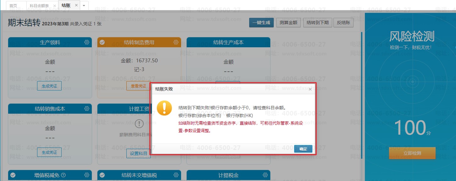 在系统做账支持结账时自动检查现金、银行存款赤字不允许结账,若出现余额负数,系统将自动检查并给予提示“现金、银行存款余额小于0”,会计可根据提示检查具体的科目余额,甚至是哪个币别的余额,及时处理问题。