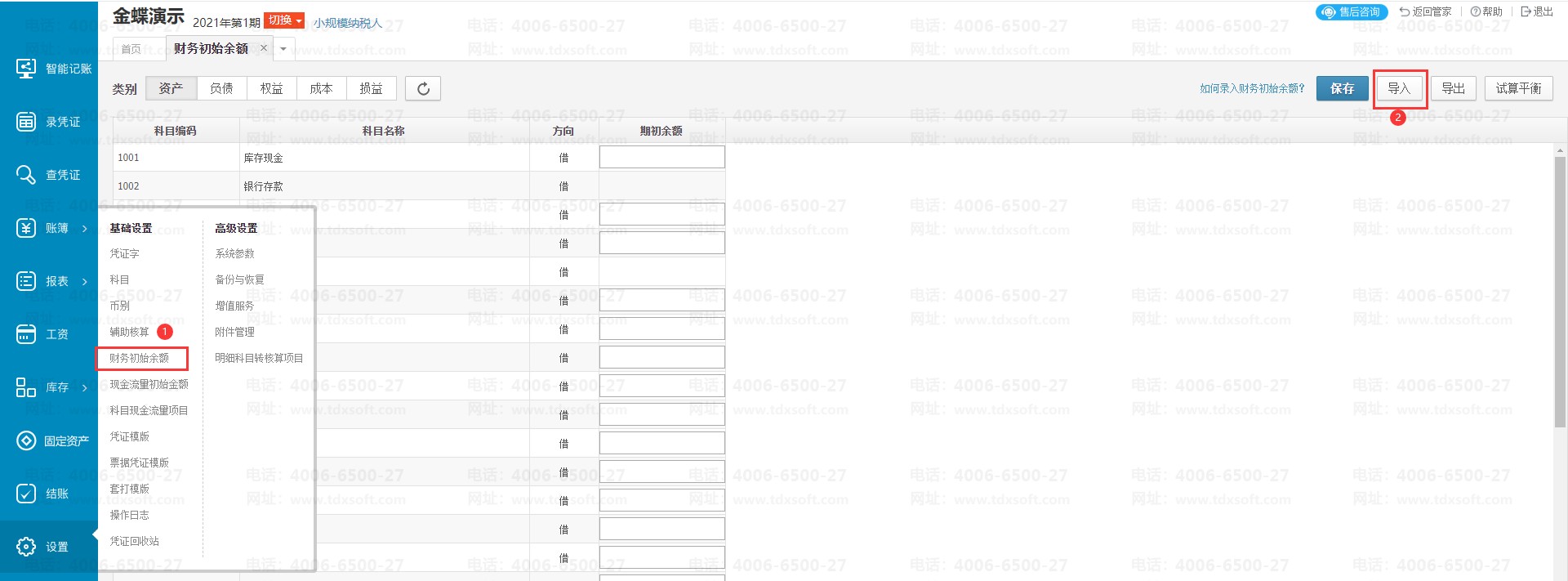 【设置】-【财务初始余额】-【下载模板】下载模板录入数据后导入即可