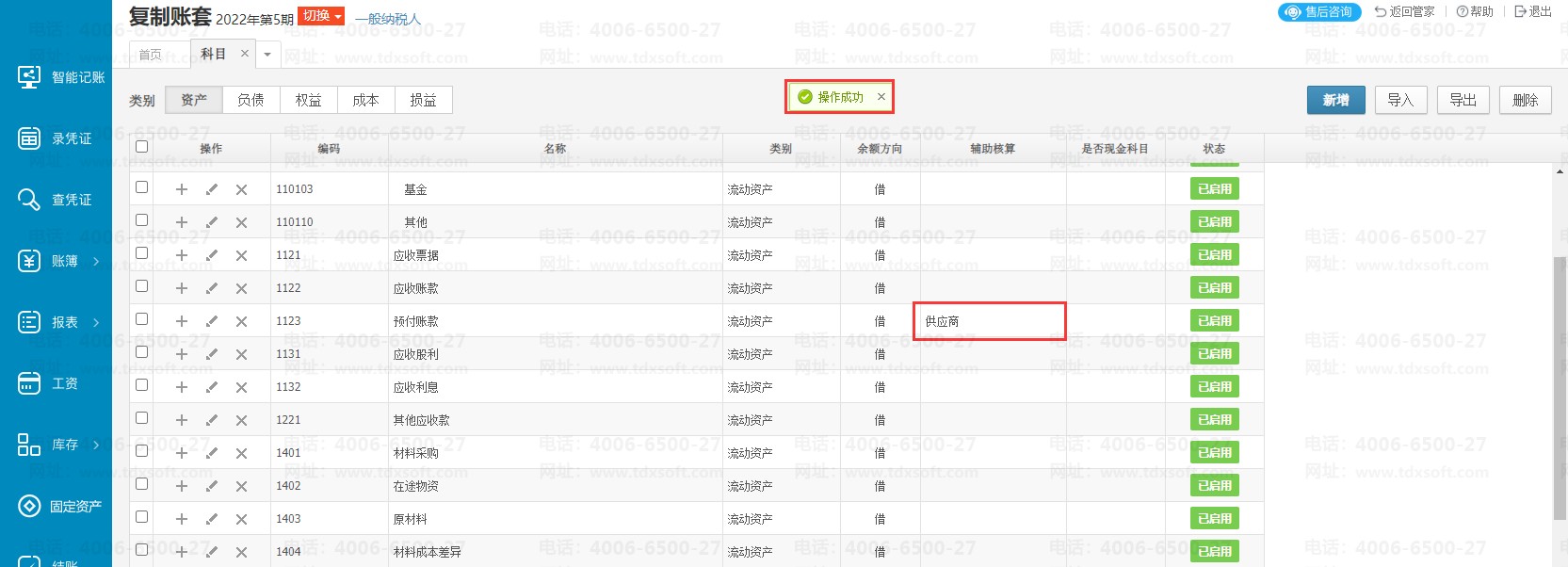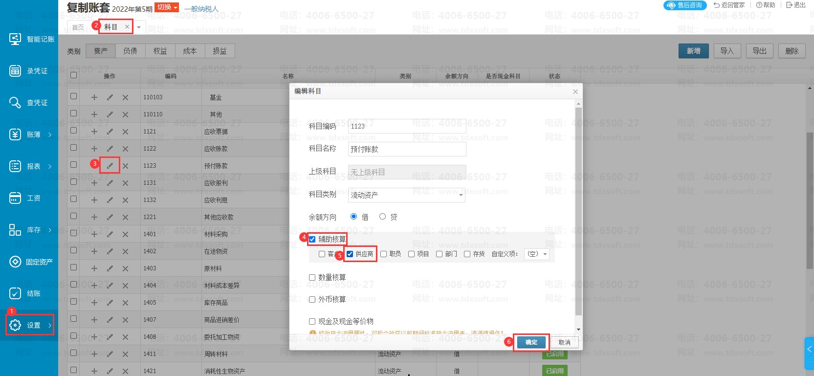 如图示例给科目1123预付账款启用供应商辅助核算。
