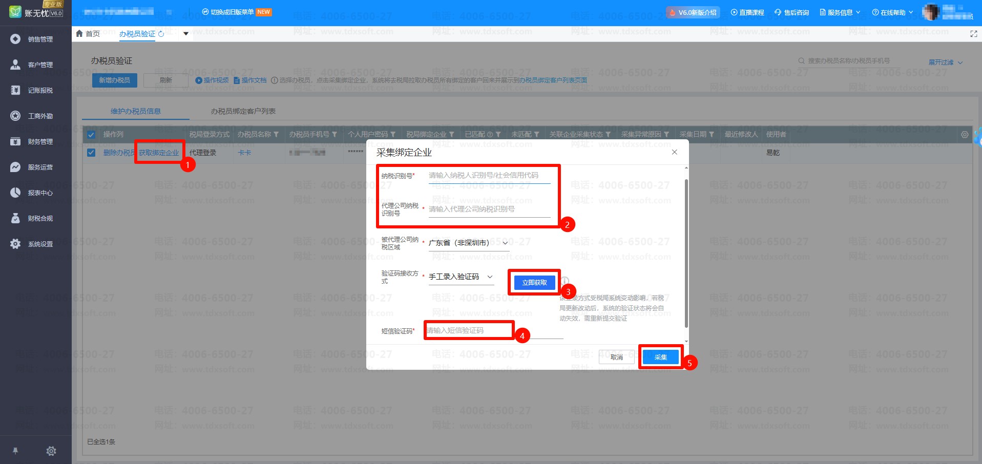 在办税员验证界面,点击【采集绑定企业】,输入该办税员绑定的任意一家企业的税号,选择对应【纳税区域】和【验证码接收方式】,点击【立即获取】,输入手机上收到的验证码,然后点击【采集】。
