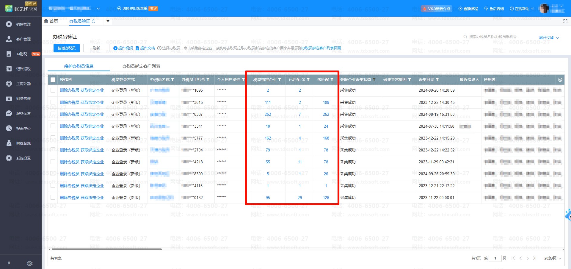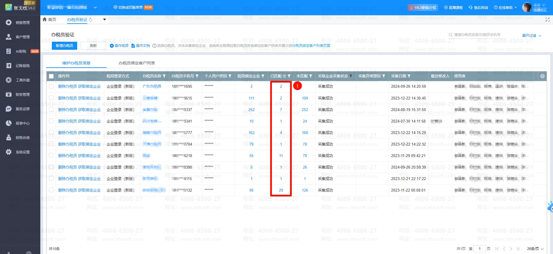点击【维护办税员列表】里的【已匹配】列的蓝色数字进入办税员绑定客户列表