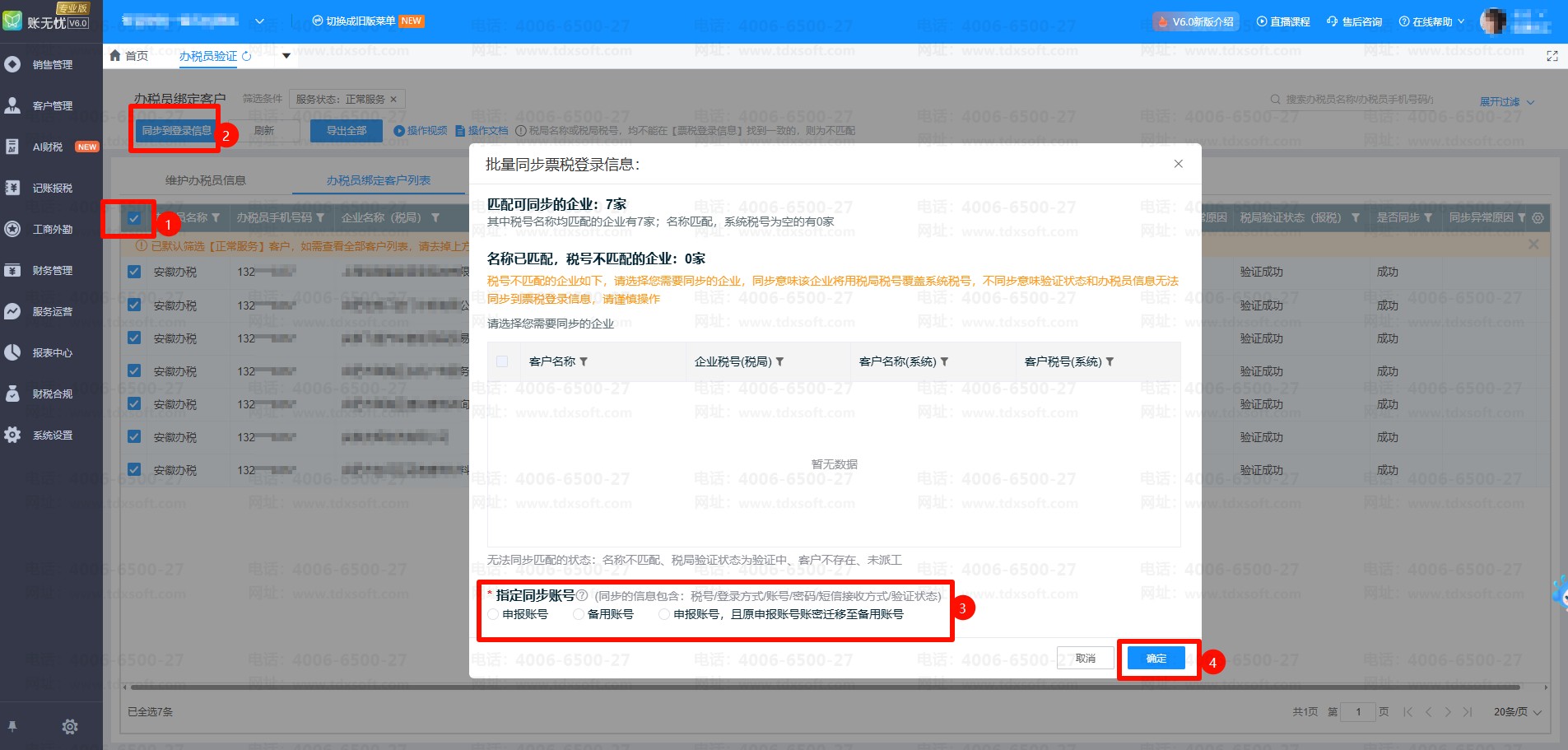 勾选企业,点击【同步到登录信息】,选择【指定同步账号】后,点击【确定】即可完成这部分企业的税局验证
