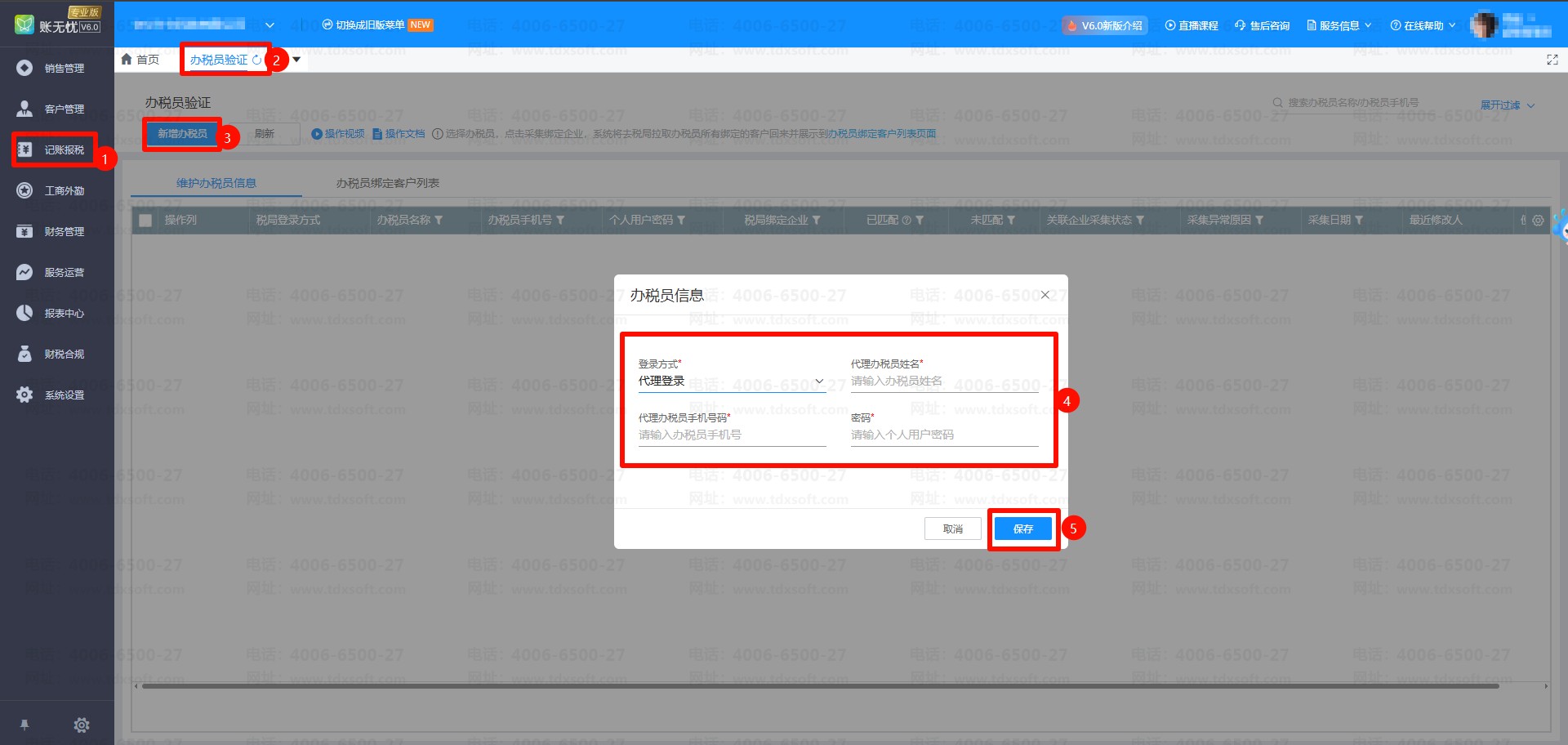 点击【记账报税】→【办税员验证】→新增办税员,选择【登录方式】(企业登录或代理登录),填写好对应需要的“办税员姓名”“办税员手机号码”和“办税员的个人用户密码”,然后点击【保存】即可。