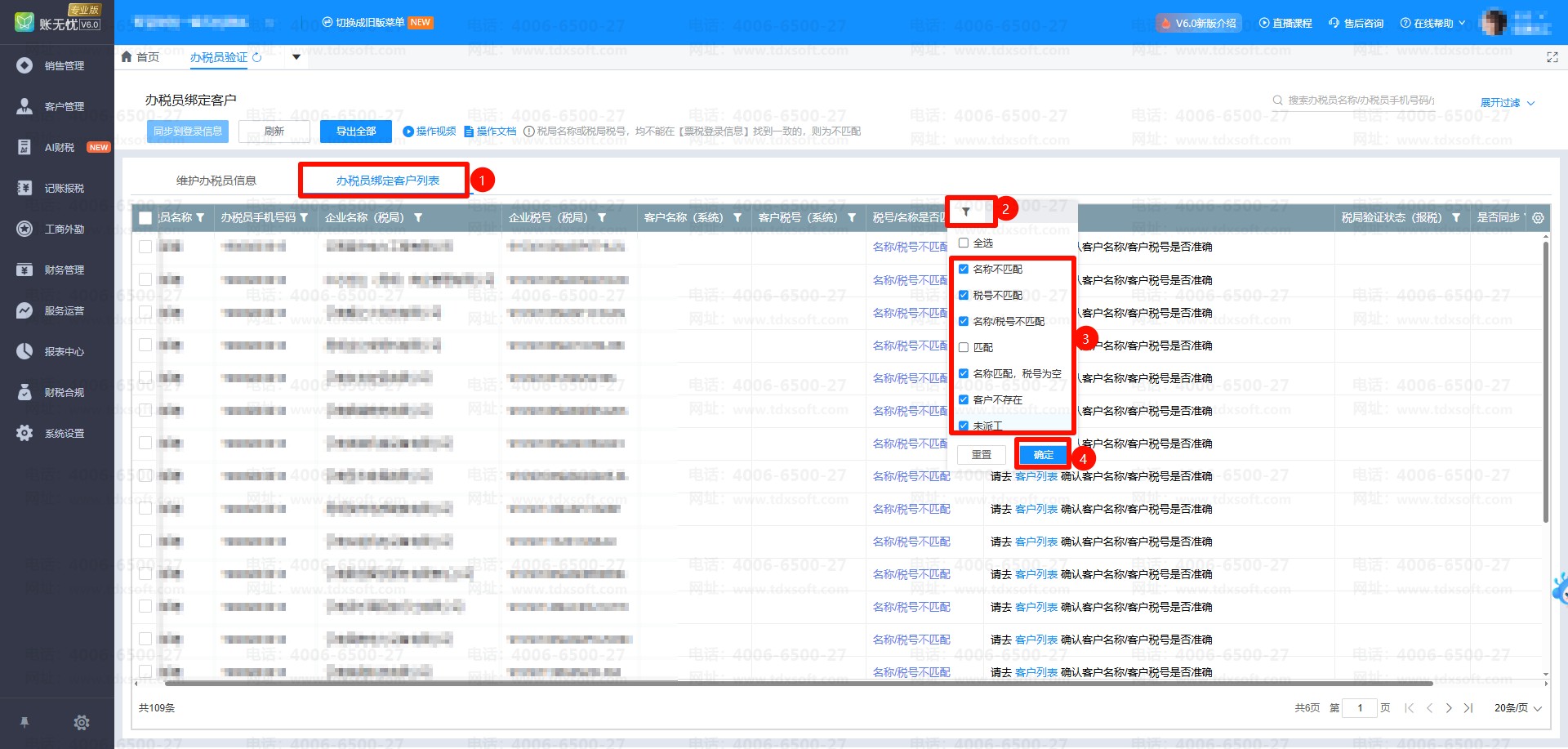 点击【办税员绑定客户列表】,筛选是否有不匹配的客户