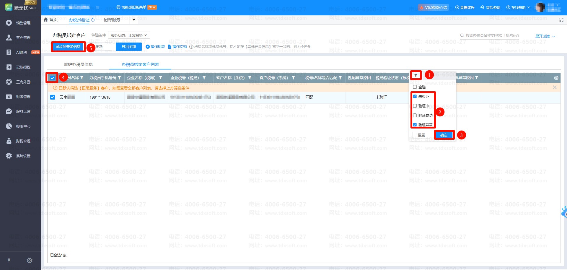 采集完成后,可以进入【办税员绑定客户列表】,筛选【未验证】和【验证异常】的企业,进行【同步到登录信息】