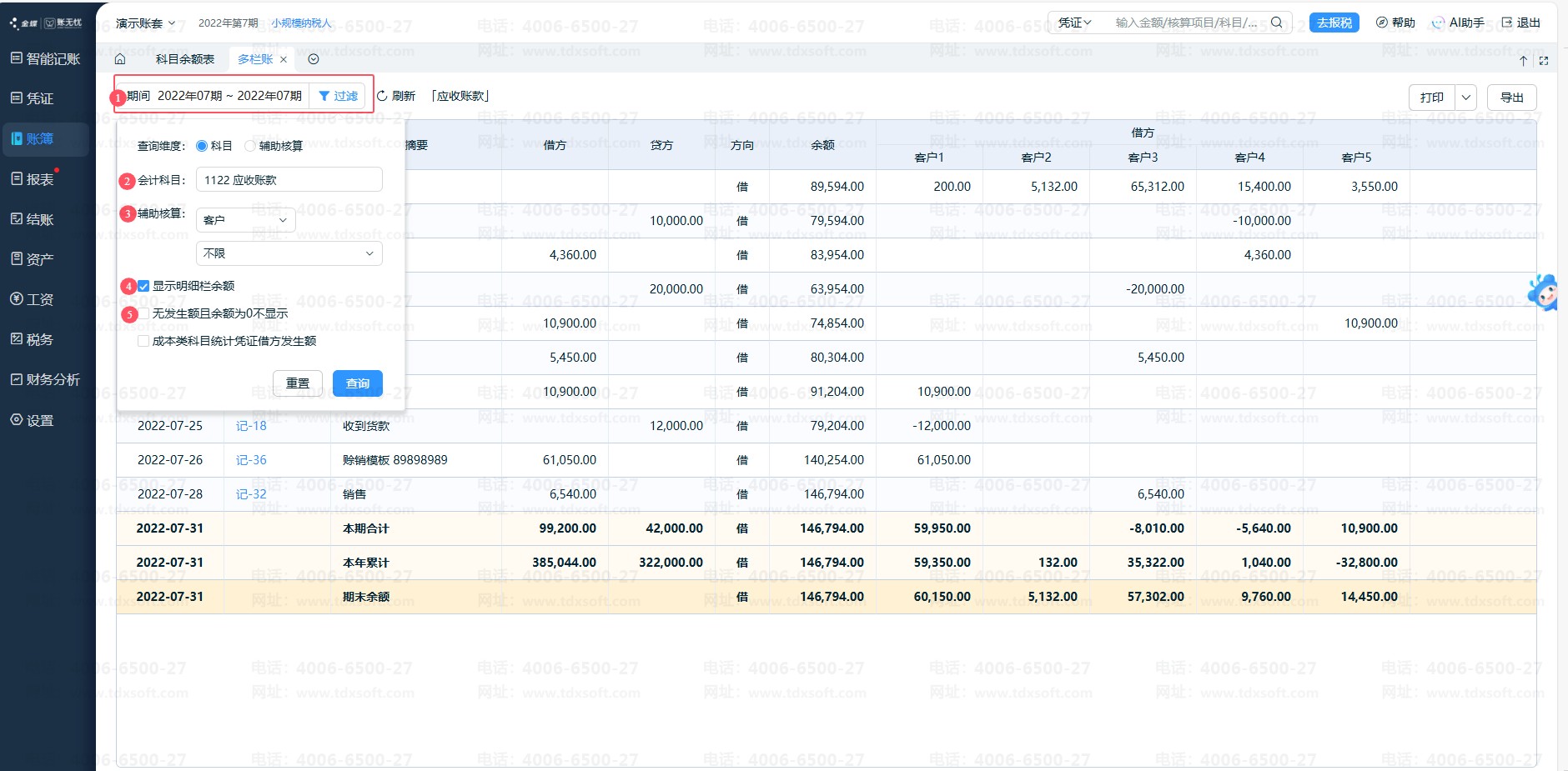 • 只显示下级科目:勾选后,显示查询科目的下一级科目。如会计科目选择一级科目,勾选后,多栏账显示二级科目;