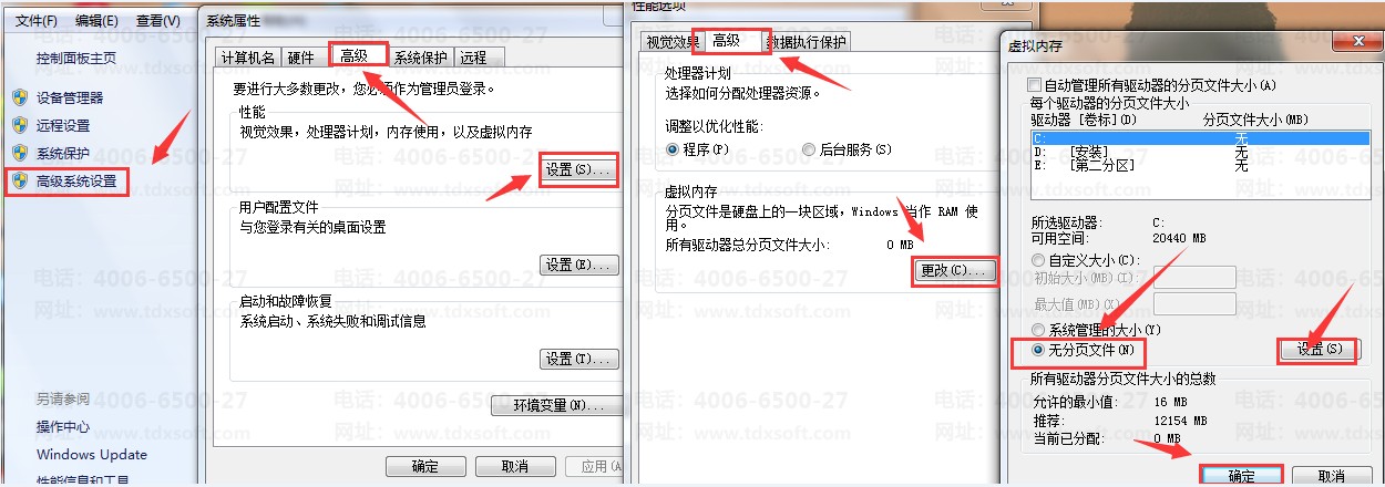 计算机右键属性-->高级系统设置-->性能-设置-->高级-更改-->无分页文件-设置,最后点击确定即可