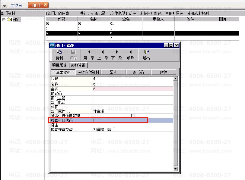 2、找到单据上的部门双击打开,在部门信息基本资料页签下对核算科目代码字段进行维护,录入相应的科目即可。