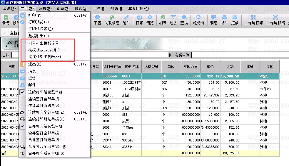 2、点击左上角【文件】下的引入引出模板设置,设置对应需要引出引入的字段后,按模板引出到EXCEL,在EXCEL维护好后,再点击按模板从EXCEL引入,选择对应的EXCEL文件引入。如下图所示:
