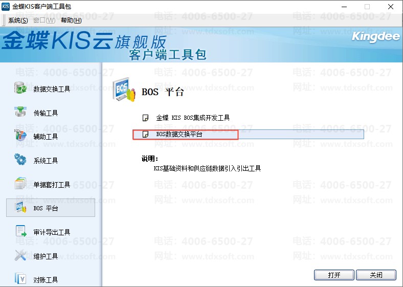 1、进入左上角【系统】→【客户端工具包】→【BOS平台】→【BOS数据交换平台】,如下图所示: