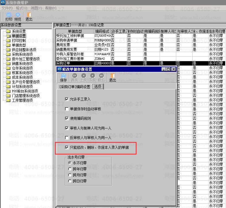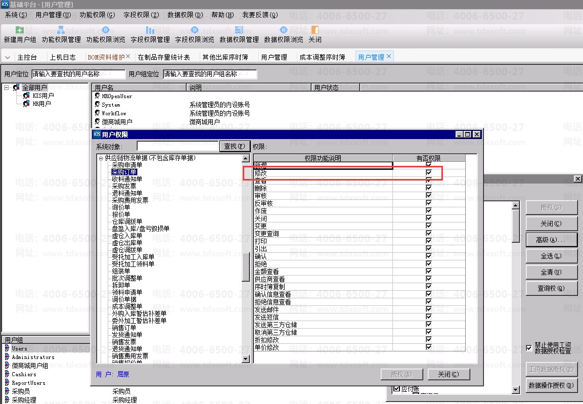 2、检查用户管理对应用户是否有采购订单的修改权限;