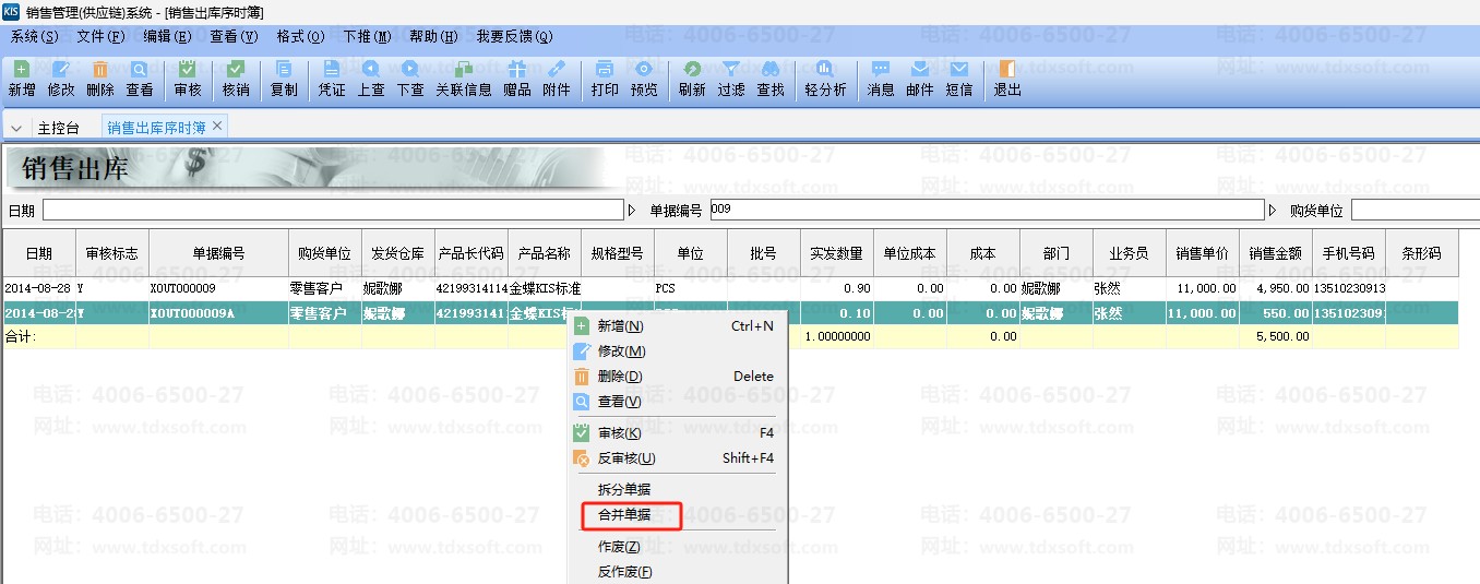 2、【销售序时簿】界面左边选择拆分出来的子单(源单单号+A),点编辑下拉菜单的合并单据;